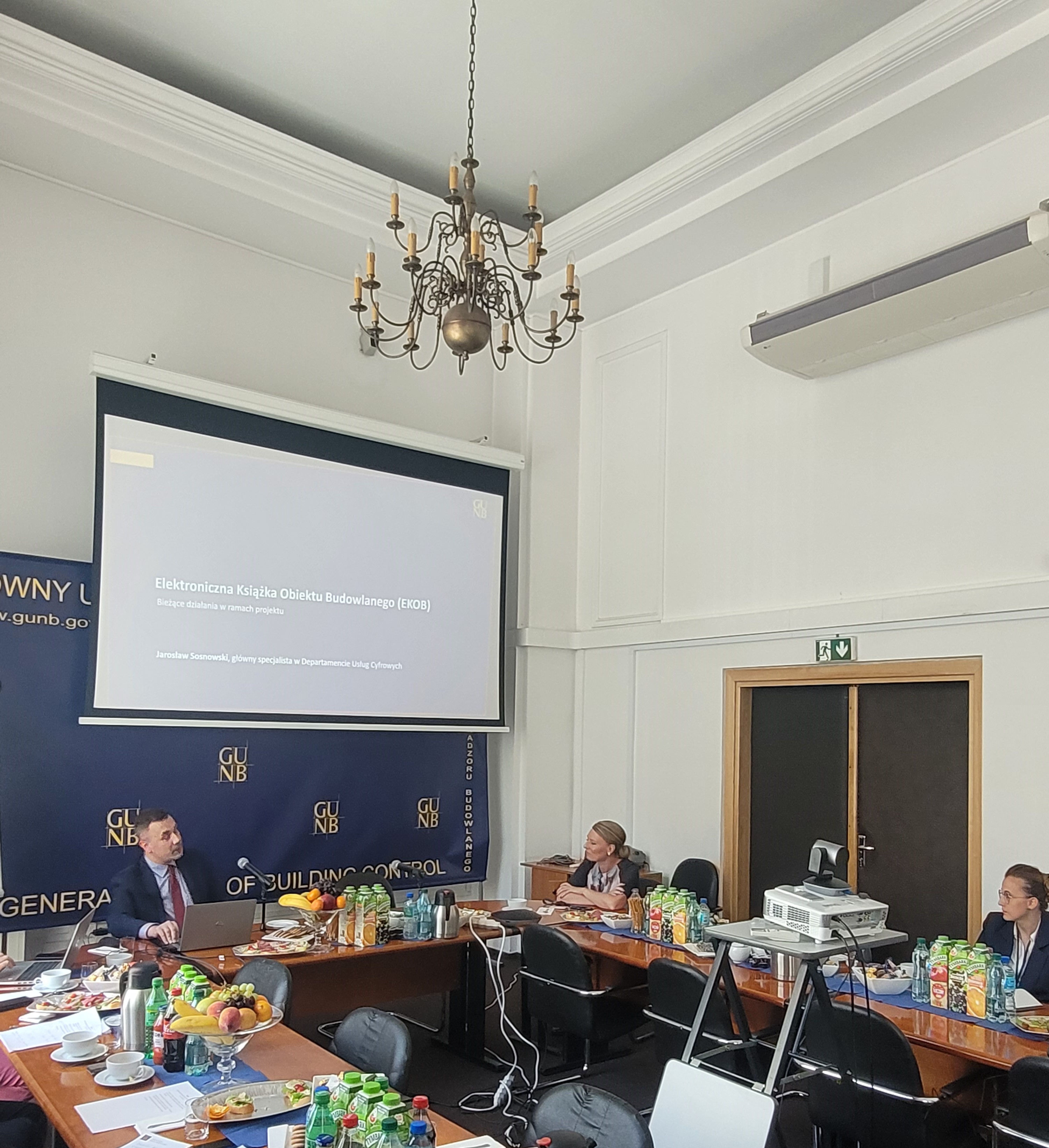 Kolejne tematy przedstawili przedstawiciele GUNB, którzy zaprezentowali następne etapy w procesie cyfryzacji budownictwa i związane z tym cele, planowane kroki związane z nowelizacją ustawy Prawo budowlane, w tym przygotowywane zmiany przepisów dotyczących procesu inwestycyjno-budowlanego, założenia i przygotowanie GUNB do planów wprowadzenia EKOB, czyli Elektronicznej Książki Obiektu Budowlanego.