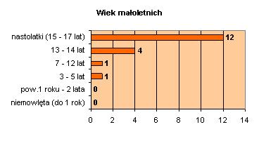 11 dzieci w momencie zgłoszenia do KCIK pozostawało pod stałą opieka przynajmniej jednego z rodziców. Pozostałe 7 dzieci pozostawione bez opieki było cudzoziemcami i przebywało na terytorium Polski bez przedstawiciela ustawowego. Analogicznie jak w przypadku małoletnich włączanych do Programu wsparcia (analizowanego powyżej) dzieci bez opieki to nastolatki. Najmłodsze z nich miało lat 13.