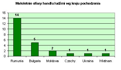 Spośród wszystkich dzieci zgłoszonych do Programu najwięcej, bo aż 14 (ponad 58%) pochodziło z Rumunii. Byli oni w wykorzystywani do żebractwa i/lub pracy. Kolejne 5 było obywatelami Bułgarii (ponad 20%). Były to dziewczyny wykorzystywane seksualnie, w tym również zmuszane do prostytucji. W pozostałych przypadkach, dzieci pochodziły z Mołdowy (8%) i były zmuszane do żebractwa, a także z Czech (4%), Ukrainy (4%) oraz Wietnamu (4%) i były wykorzystywane seksualnie, a w przypadku obywatelek Czech i Ukrainy także do prostytucji.
