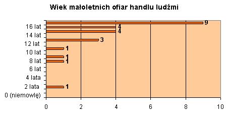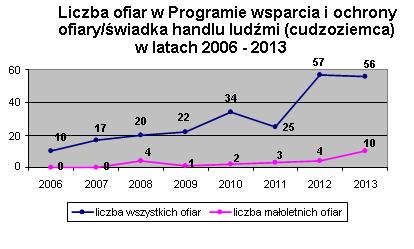 Mając natomiast na uwadze dane dotyczące realizacji "Programu wsparcia i ochrony ofiary/świadka handlu ludźmi" należy wskazać, iż na przestrzeni 8 lat funkcjonowania Programu (tj. w latach 2006 - 2013) pomocy udzielono 24 małoletnim, co stanowi zaledwie niecałe 10 % wszystkich przypadków zgłoszonych do Programu. Przez pierwsze 2 lata wykonywania Programu nie odnotowano żadnego przypadku małoletniej ofiary handlu ludźmi. Dopiero począwszy od 2008 r. organy ścigania odpowiedzialne za zgłaszanie cudzoziemców - ofiar handlu ludźmi zaczęły włączać do Programu również osoby niepełnoletnie. W latach 2008 - 2012 odsetek takich przypadków był jednak wciąż na bardzo niskim poziomie i wahał się od 1 do 4 zgłoszeń rocznie. W 2013 r. liczba małoletnich ofiar objętych Programem wzrosła do 10 osób, co stanowi niecałe 18 % wszystkich cudzoziemców włączonych w 2013 r. do Programu i stanowi najwyższy wskaźnik od początku istnienia zadania.