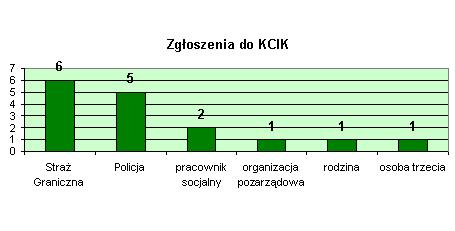Wszystkie 11 dzieci - rozpoznane jako ofiary handlu ludźmi - były zgłoszone do KCIK bezpośrednio przez organ je identyfikujący (tj. Policję lub Straż Graniczną). W pozostałych przypadkach dzieci trafiły do Centrum za pośrednictwem następujących osób/instytucji: pracownika socjalnego, organizacji pozarządowej, rodziny dziecka, bliżej nieokreślonej osoby trzeciej.