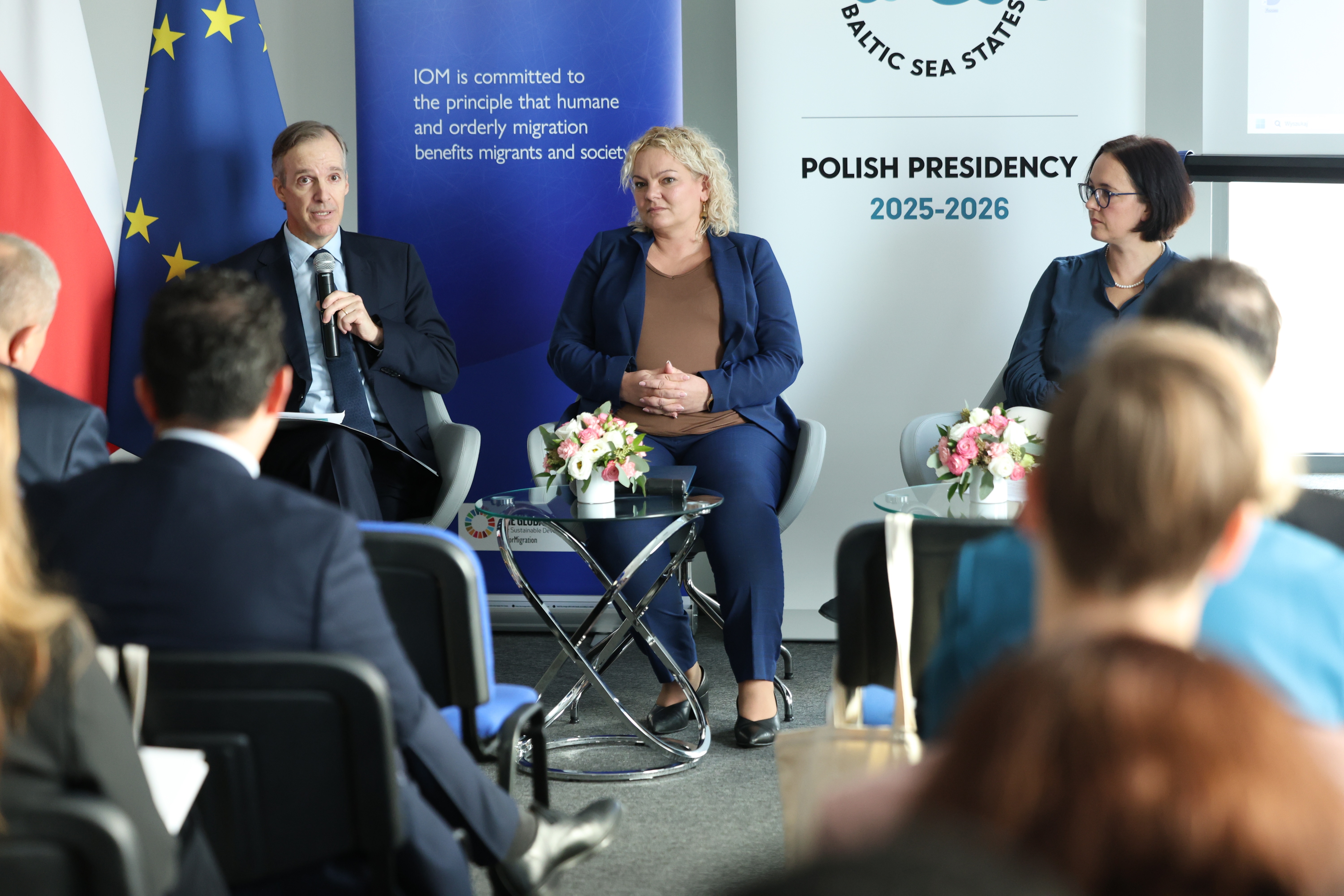 i misji dyplomatycznych”, którą przedstawili Edi Mujaj, Szef Jednostki Zadaniowej ds. Zwalczania Handlu Ludźmi (TF-THB) w Sekretariacie RPMB, oraz Lívia Styp-Rekowska, Szefowa Misji Międzynarodowej Organizacji ds. Migracji (IOM) w Polsce. Uczestnicy mieli również możliwość wzięcia udziału w warsztatach interaktywnych, prowadzonych przez doświadczonych ekspertów ze Szwedzkiej Agencji Migracyjnej oraz IOM Polska. Dodatkowo, odbył się panel ekspercki z udziałem przedstawicieli Policji, Straży Granicznej oraz IOM Polska, którego dyskusja koncentrowała się na współpracy międzyinstytucjonalnej.