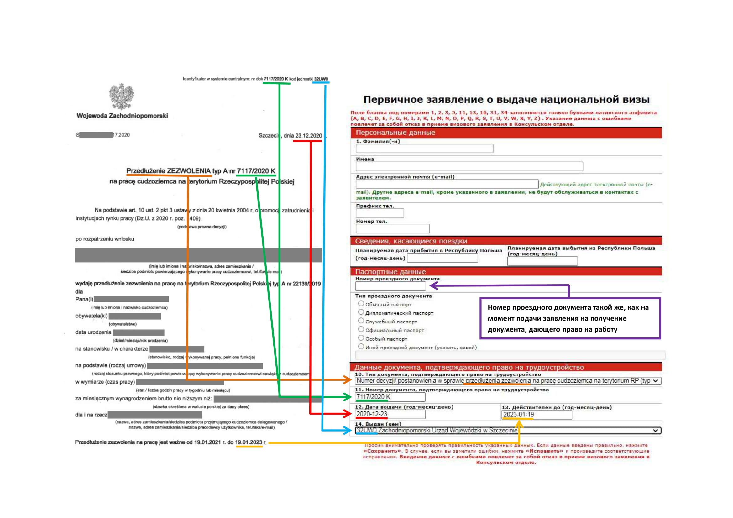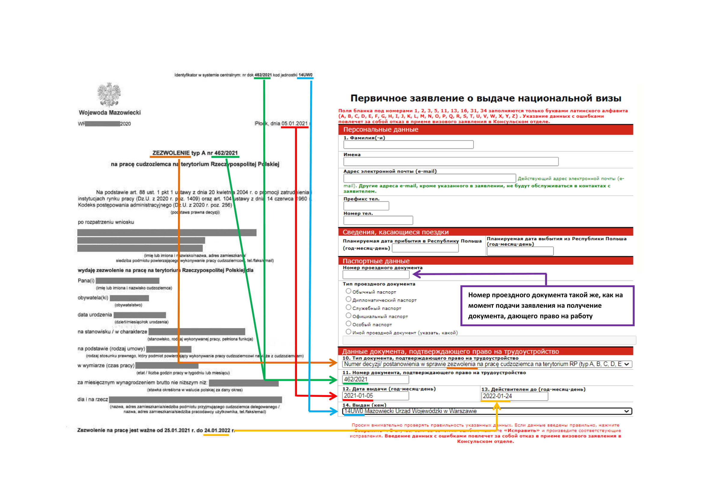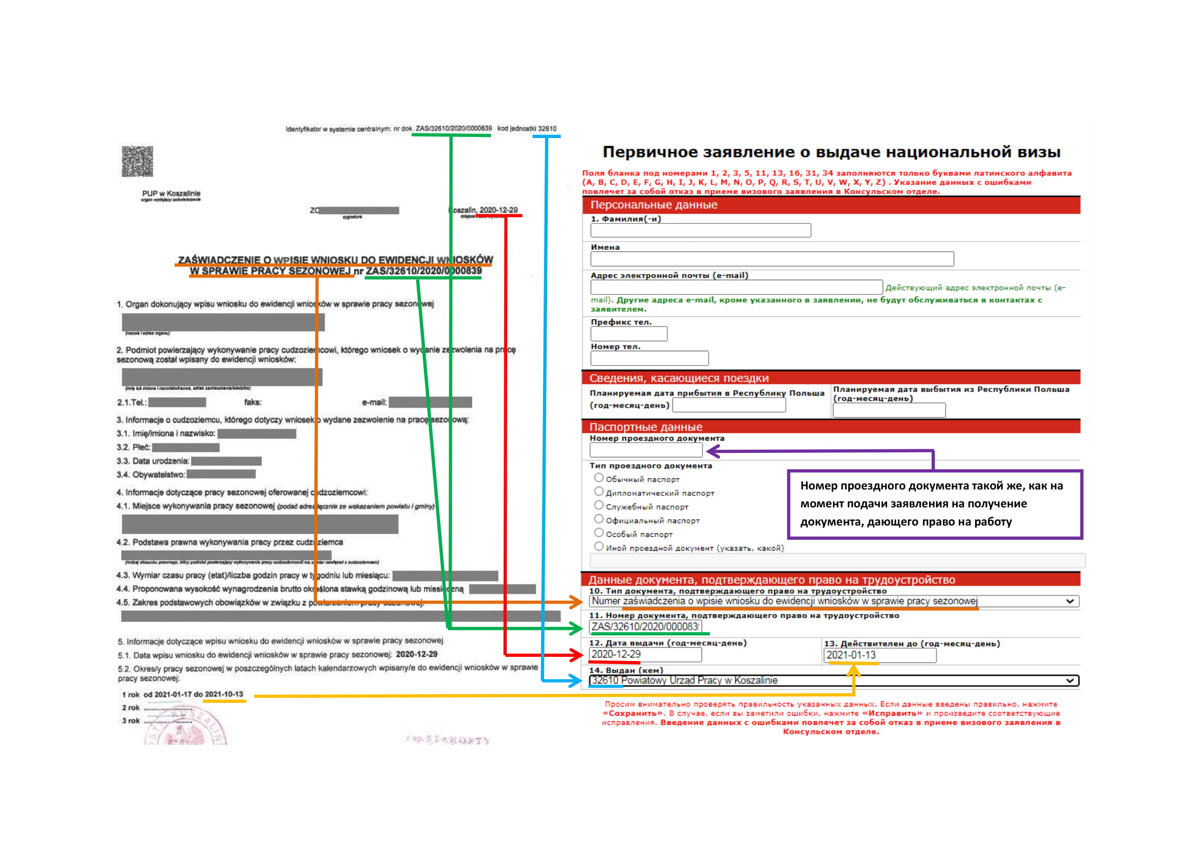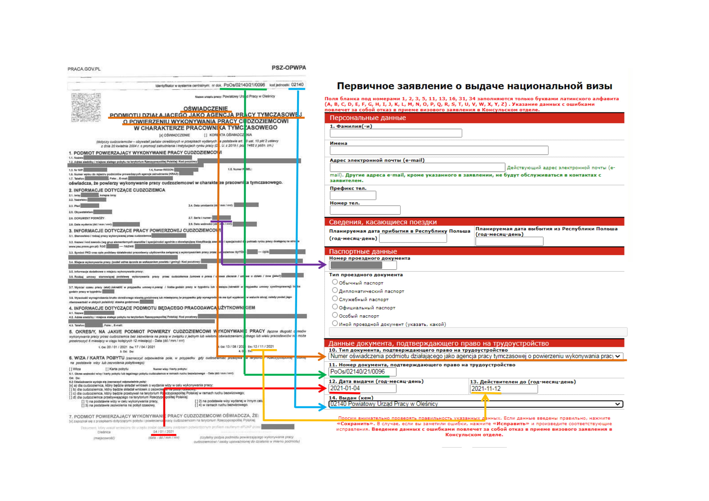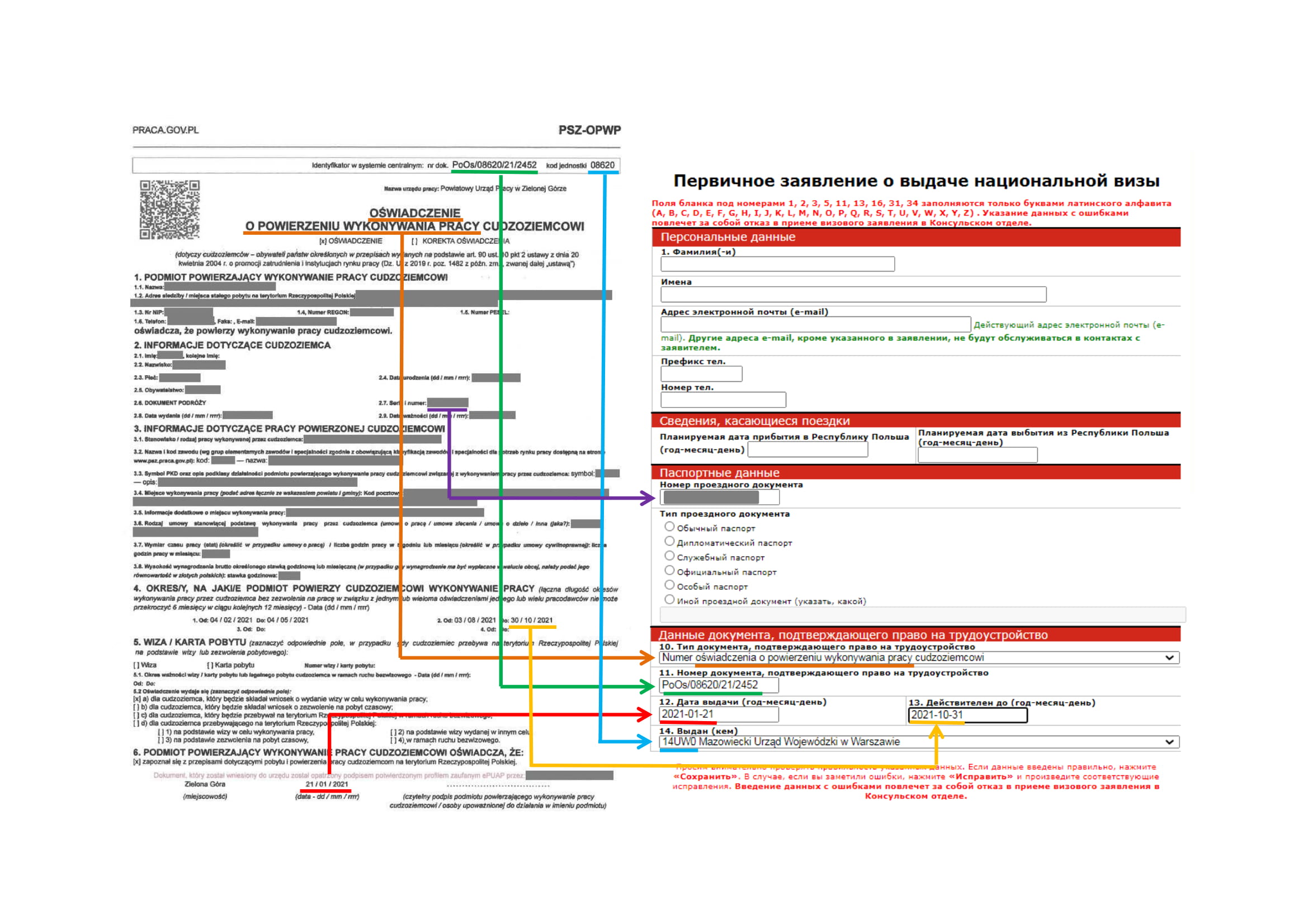 - MENU հատվածում ընտրել „Национальная Виза - Зарегистрируйте бланк”, հաջորդիվ` „Национальная Виза - работа” կամ „Национальная Виза - другие” , լրացնել արտոնագրային հայտում Ձեր հիմնական տվյալներն, ինչպես նաև Լեհաստանում Ձեր աշխատանքը լիազորող փաստաթղթի տվյալները: Տվյալները ճշգրիտ մուտքագրելու դեպքում կստանաք արտոնագրային դիմում-հայտը լրացնելու հղում պարունակող էլ. հաղորդագրություն: Դիմում-հայտը լրացնելու համար հատկացվում է 48 ժամ: Դիմում-հայտը լրացնելուց հետո պետք է այն պահպանել համակարգչի մեջ և տպել: Եթե տվյալները պատշաճ կերպով լրացված չլինեն կամ արտոնագրային դիմում-հայտը լրացված չլինի 48 ժամվա ընթացքում, ապա գրանցումը կչեղարկվի: