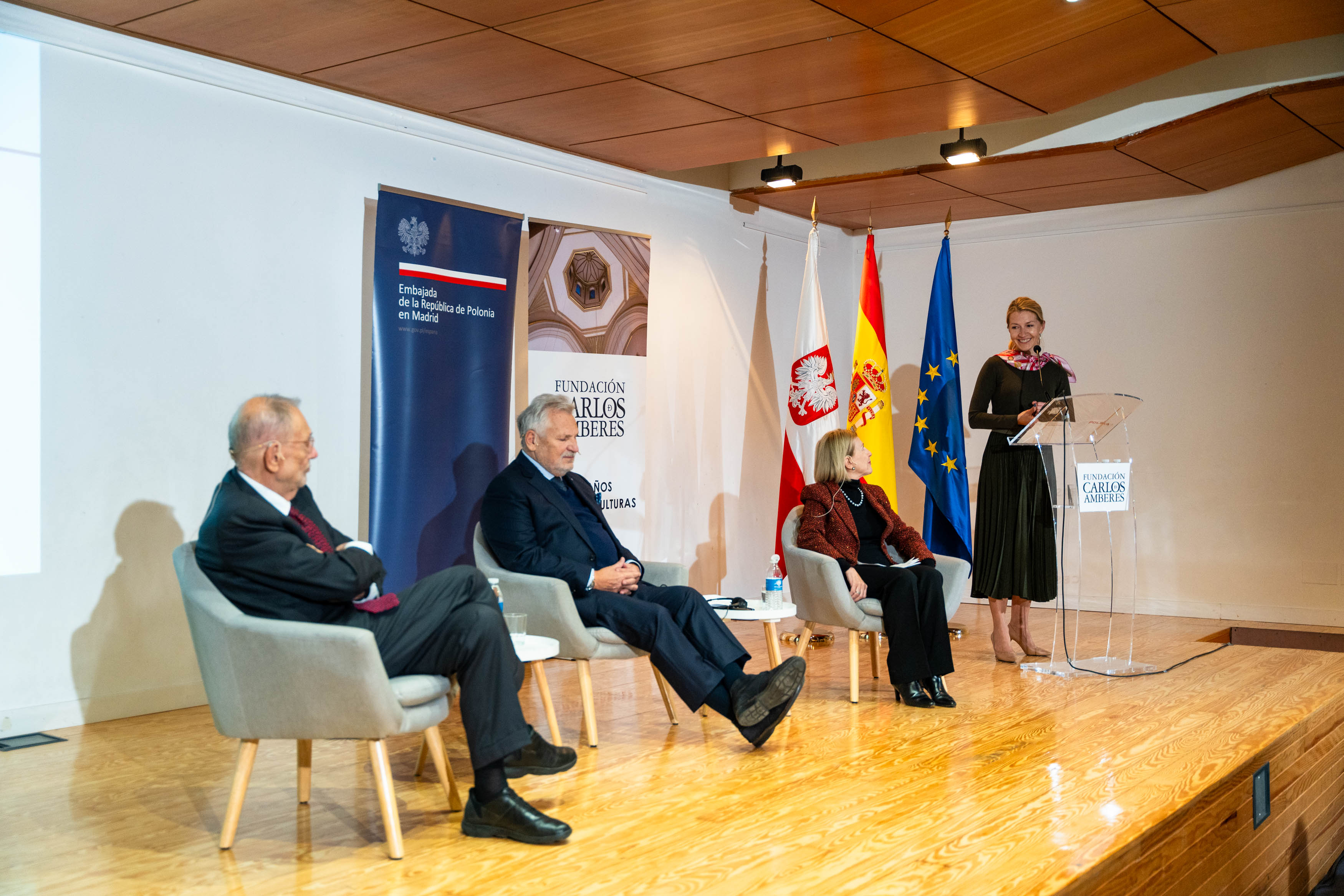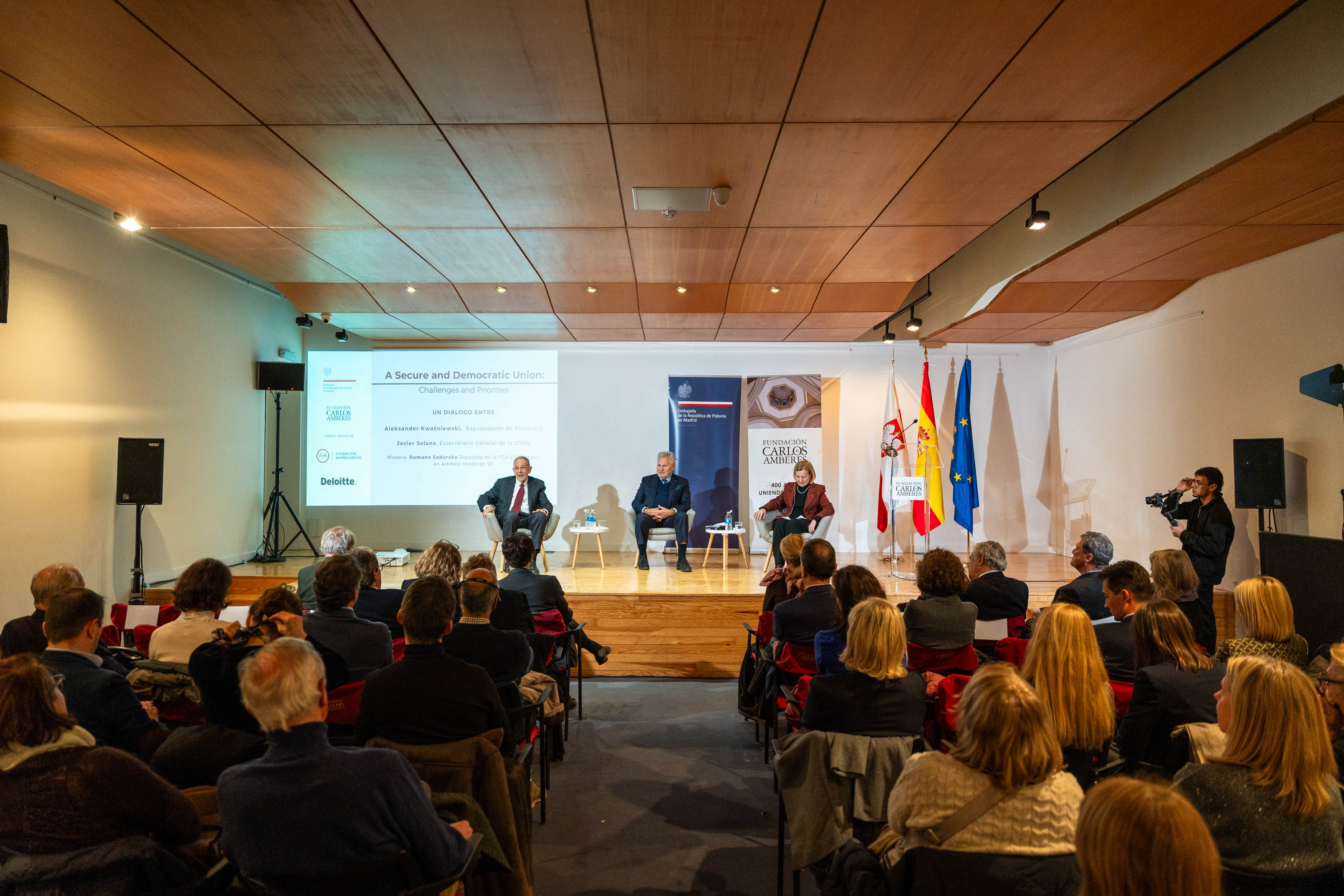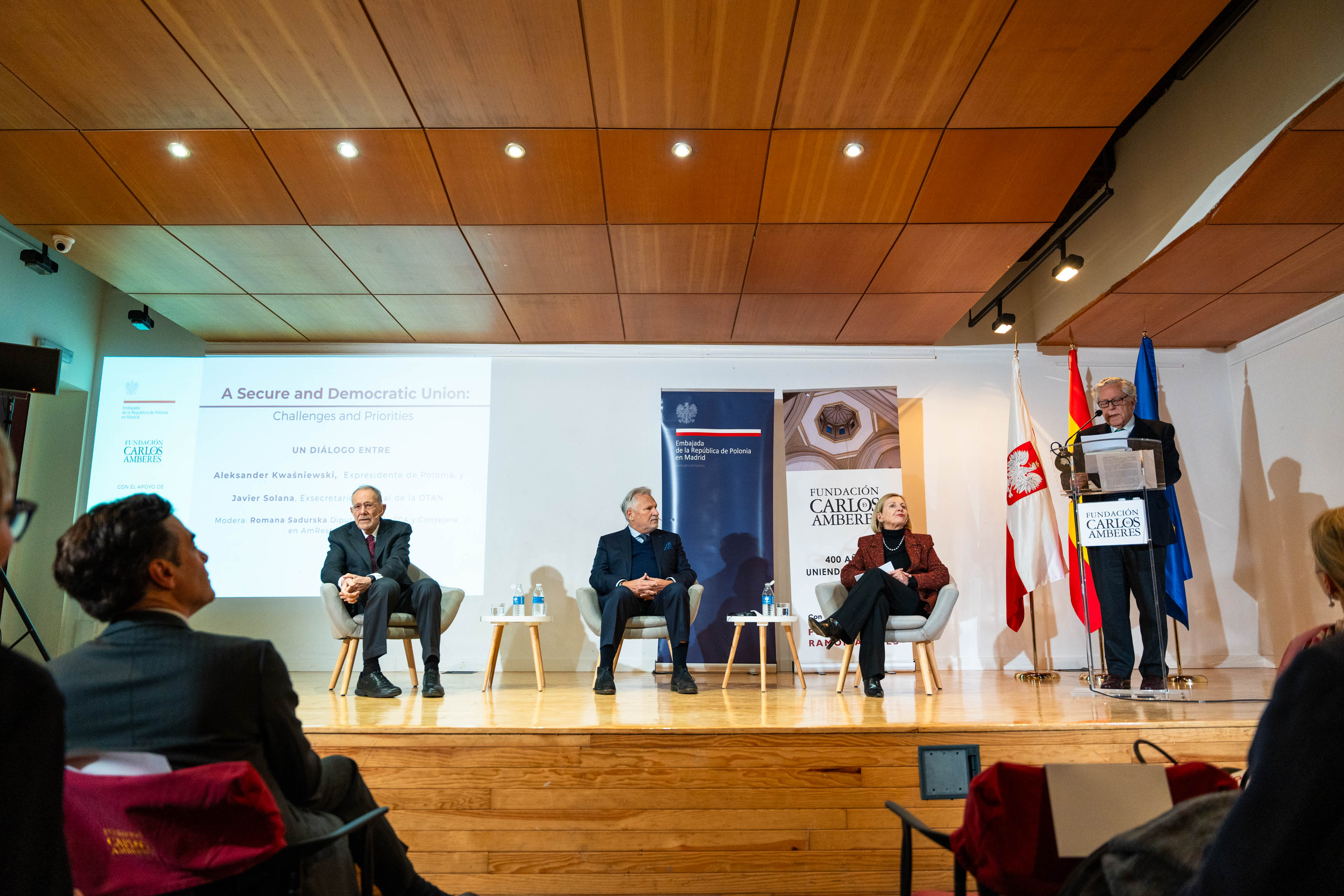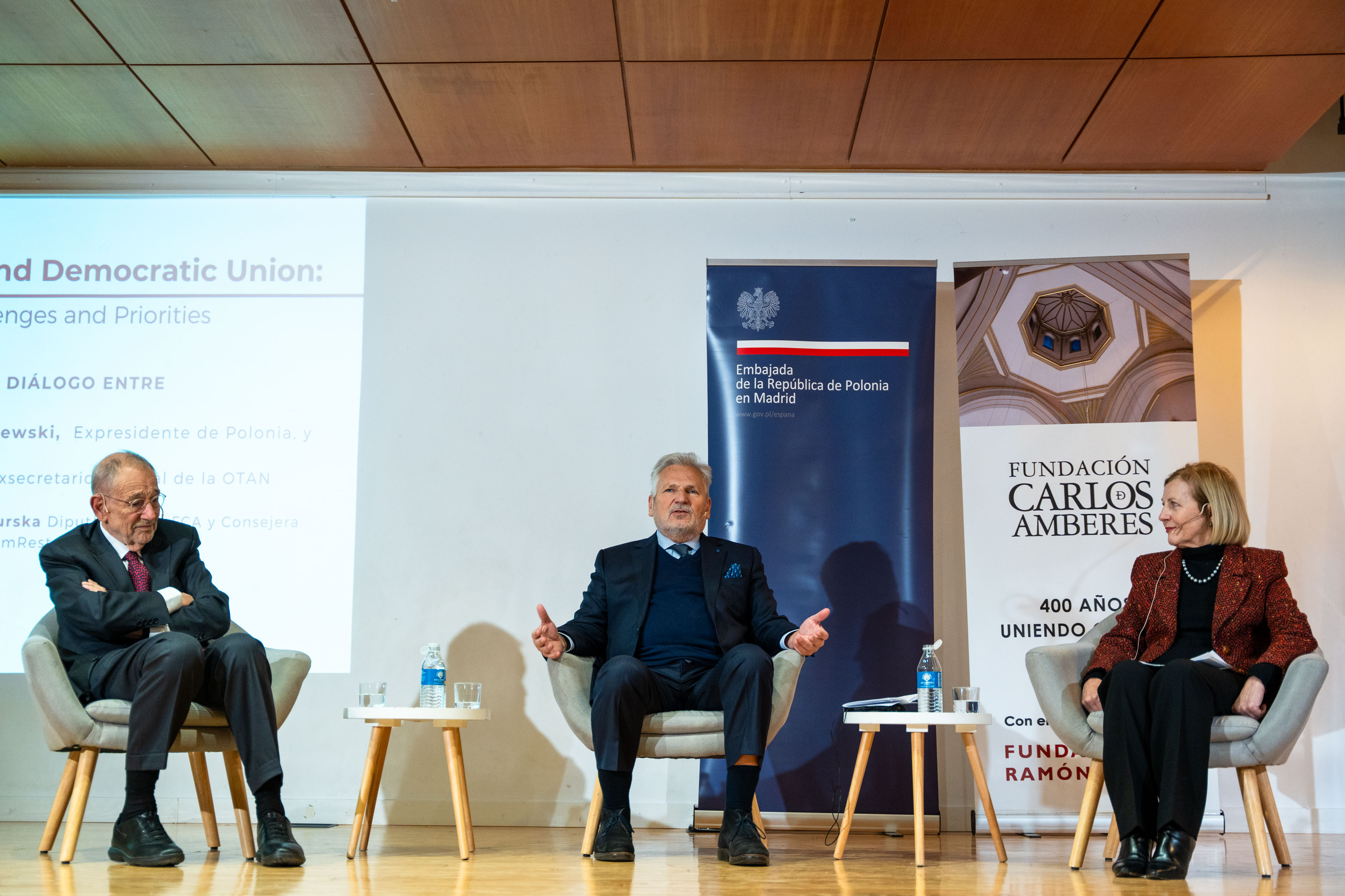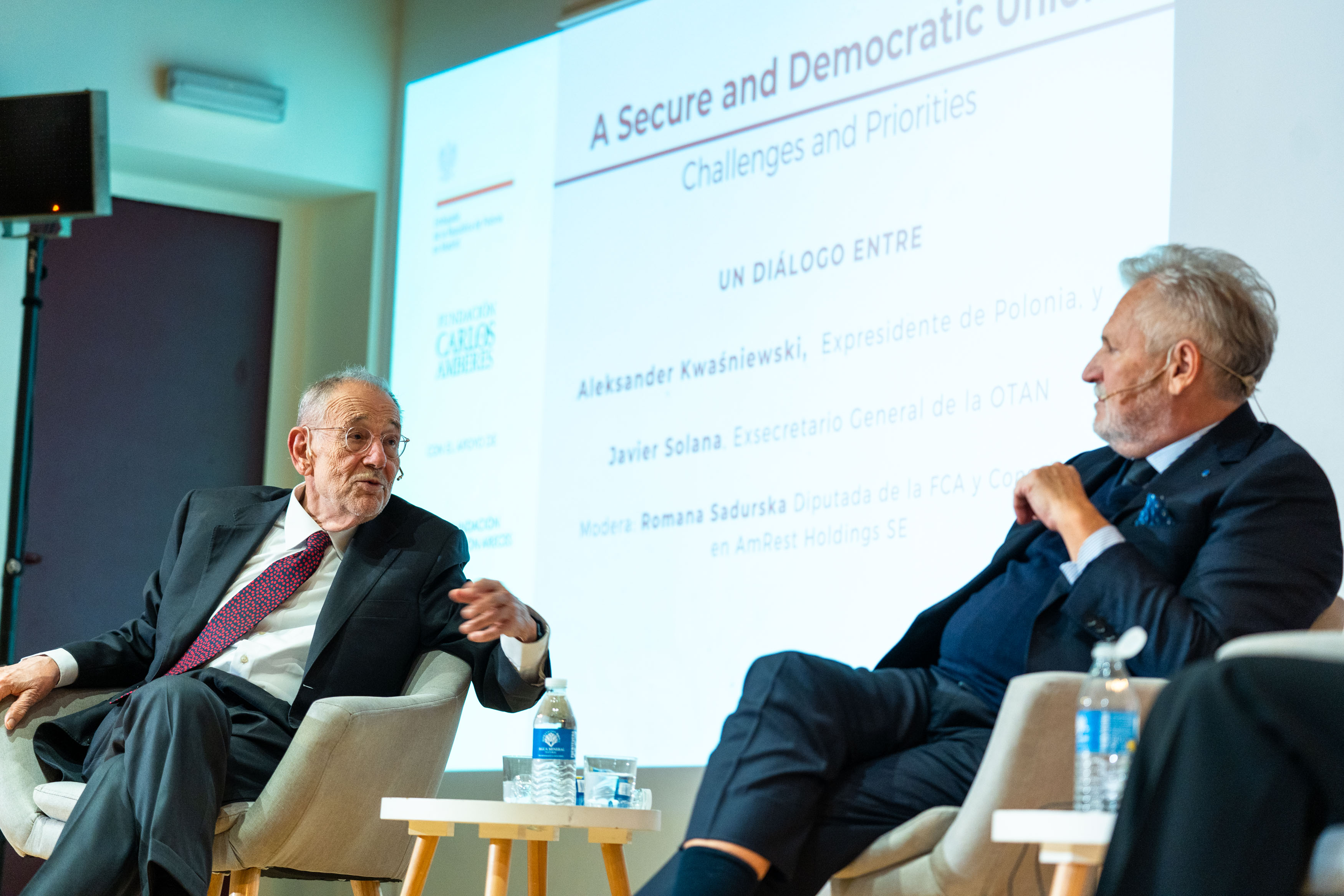 Ambasada RP w Madrycie i hiszpańska Fundacja Carlos de Amberes zorganizowała debatę pt. A Secure and Democratic Union – Challenges and Priorities of the Polish Presidency z udziałem byłego prezydenta Aleksandra Kwaśniewskiego oraz byłego sekretarza generalnego NATO Javiera Solany, w ramach obchodów 20-lecia w UE oraz 25-lecia w NATO.