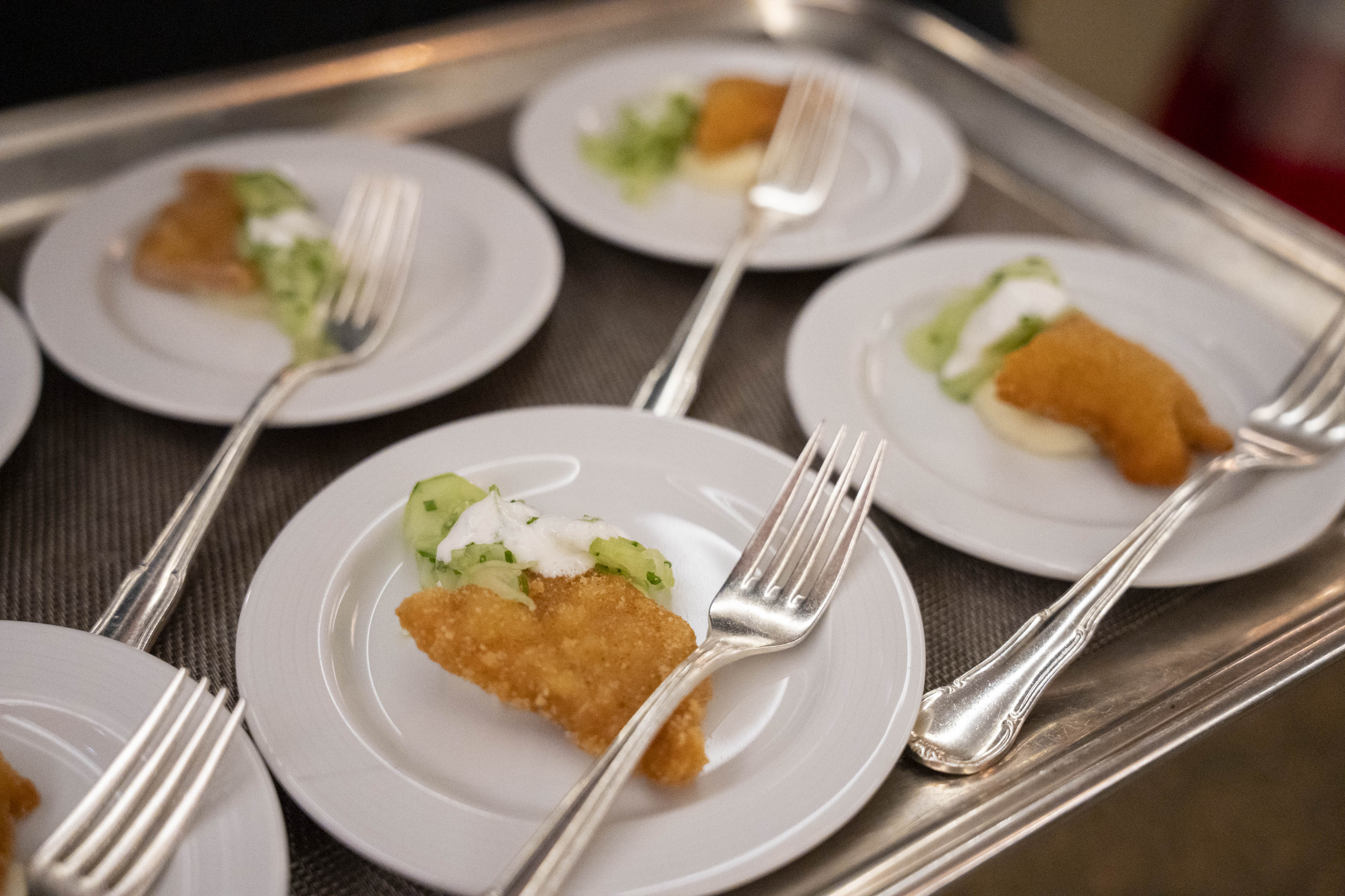 Podczas przyjęcia pan Paweł Wątor, szef kuchni w gdańskiej restauracji Eliksir (jest ona pierwszą restauracją w Polsce z Zieloną Gwiazdką Michelin) oraz jego pomocnik, przygotowali dla gości polskie dania.