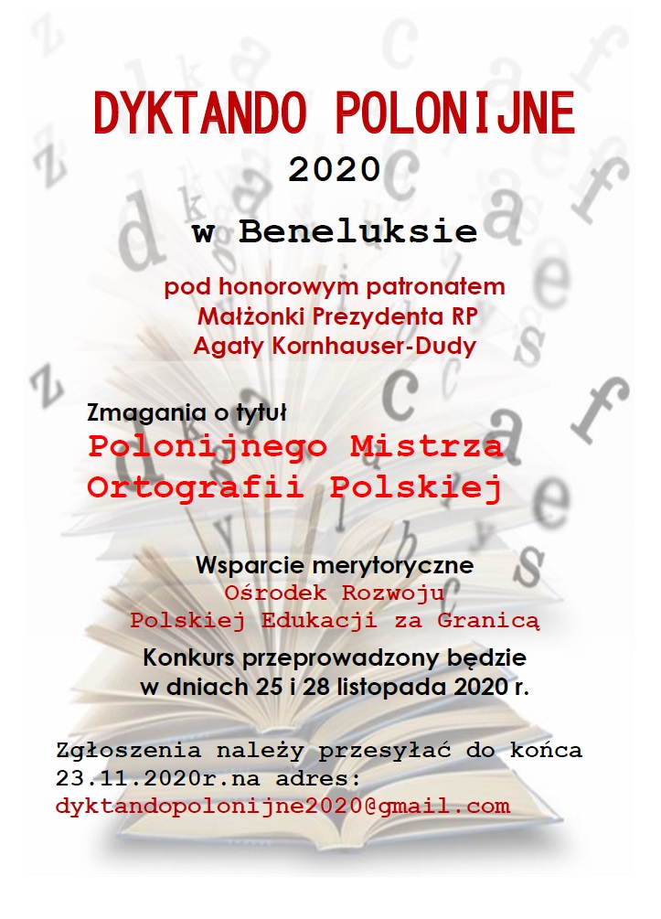 Organizatorem Polonijnego Konkursu Ortograficznego „Dyktando Polonijne 2020 w Beneluksie” jest Wydział Konsularny Ambasady RP w Brukseli we współpracy z Wydziałem Konsularnym Ambasady RP w Hadze oraz: