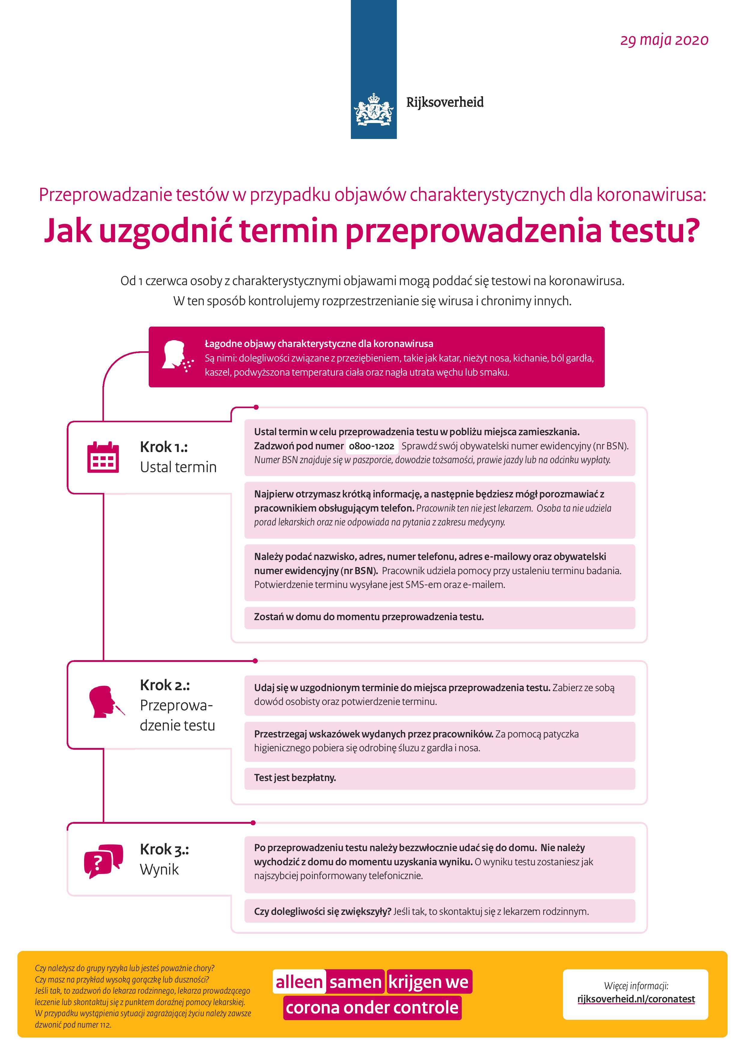 Przedstawiamy informacje holenderskiego Ministerstwa Zdrowia, Dobrobytu i Sportu dotyczące sposobu umówienia się na test na koronawirusa w Holandii.