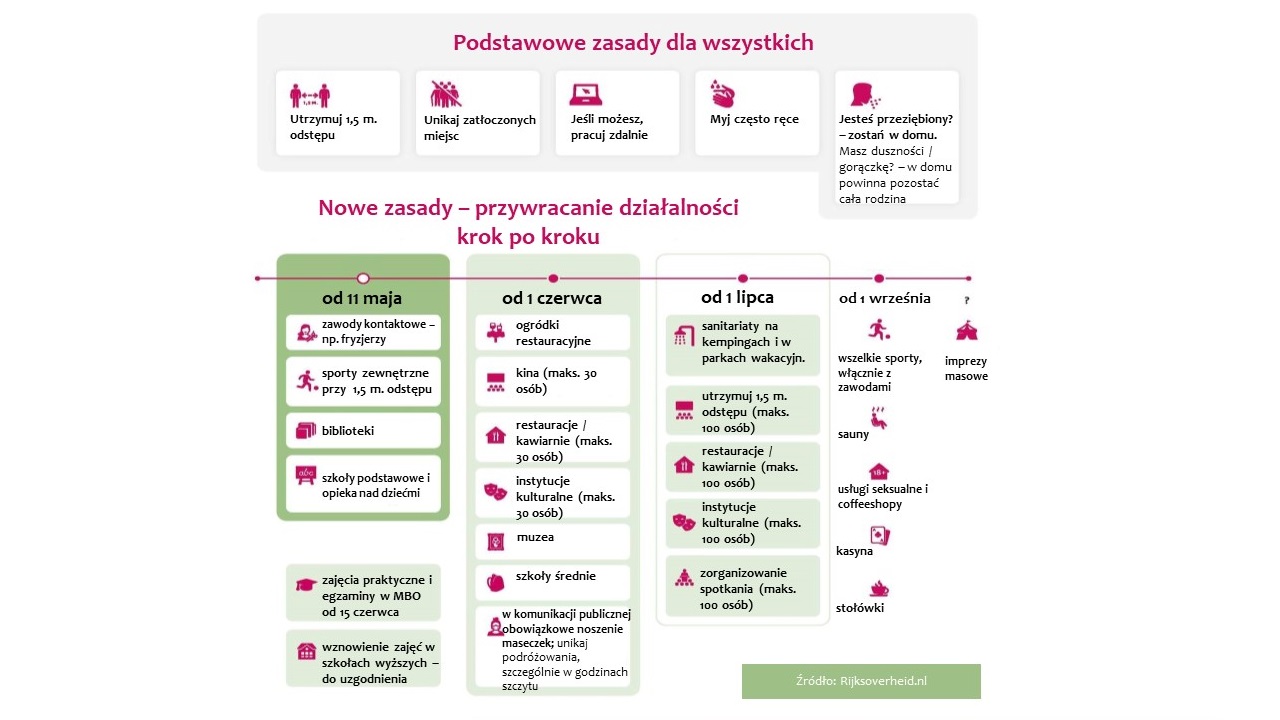 Od poniedziałku 11 maja holenderskie władze rozpoczynają stopniowe łagodzenie dotychczasowych obostrzeń. Jednocześnie przypominają, że przestrzeganie podstawowych zasad jest bardzo ważnie.