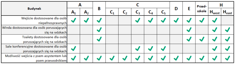 Do wszystkich budynków można wejść z psem asystującym i psem przewodnikiem. W budynkach hole, korytarze oraz przestrzenie ogólnego dostępu nie są wyposażone w oznaczenia alfabetem Braille’a oraz brak oznaczeń w druku powiększonym dla osób niewidomych i słabowidzących.