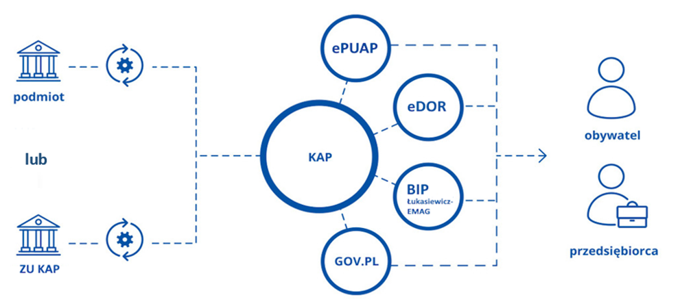 Główną grupą docelową odbiorców i użytkowników systemu będą podmioty centralne realizujące zadania publiczne. KAP pozwoli przyspieszyć realizację oraz podnieść jakość zadań realizowanych przez te podmioty. Pracownicy urzędów zostaną wyposażeni w narzędzie umożliwiające im pozyskiwanie w bezpośredni, szybki i przyjazny sposób danych na temat usług, podmiotów publicznych oraz rejestrów publicznych. Aktualizacja danych stanie się łatwiejsza, a zarządzanie nimi skuteczniejsze. System KAP przyczyni się także do zapewnienia spójności wzorów dokumentów wykorzystywanych w administracji publicznej. Dzięki KAP obywatele i przedsiębiorcy będą mieli możliwość załatwienia spraw urzędowych sprawniej i według czytelnych procedur.