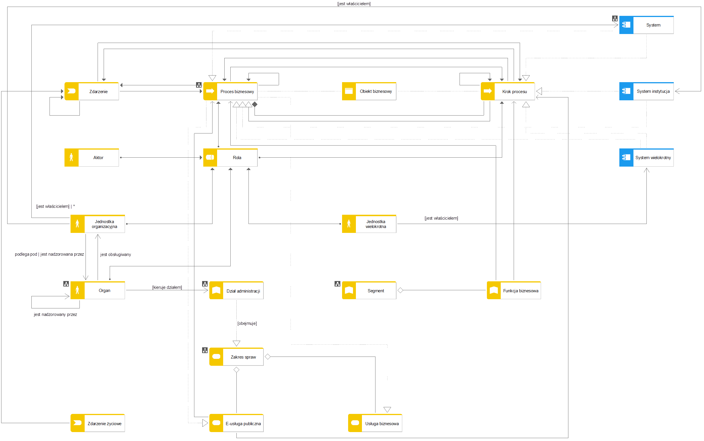Model zawiera tylko główne elementy metamodelu AIP oraz możliwych relacji pomiędzy tymi elementami. Pełna lista elementów i relacji prezentowana jest na diagramach metamodelu poszczególnych warstw. Należy także mieć na uwadze, że domyślnie dopuszczalne są relacje specjalizacji i agregacji pomiędzy tymi samymi typami obiektów w metamodelu.