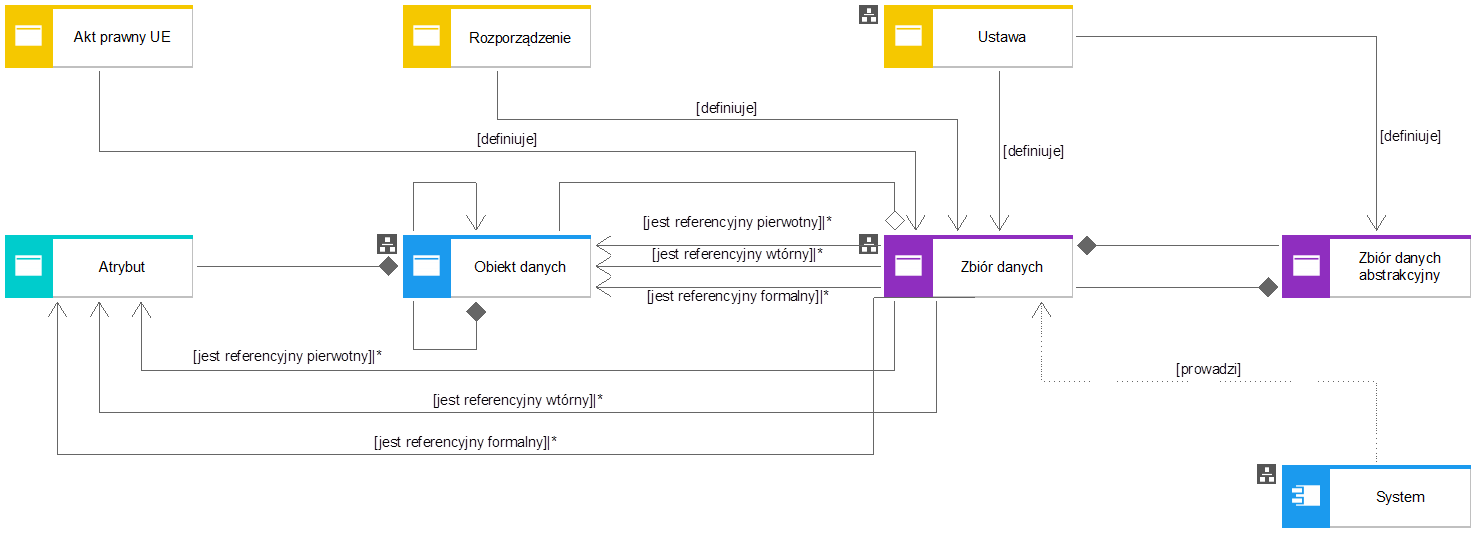W ramach modelu utrzymywana jest klasyfikacja zbiorów danych i obiektów danych, a także informacja na temat referencyjności zbiorów dla określonych zakresów danych.