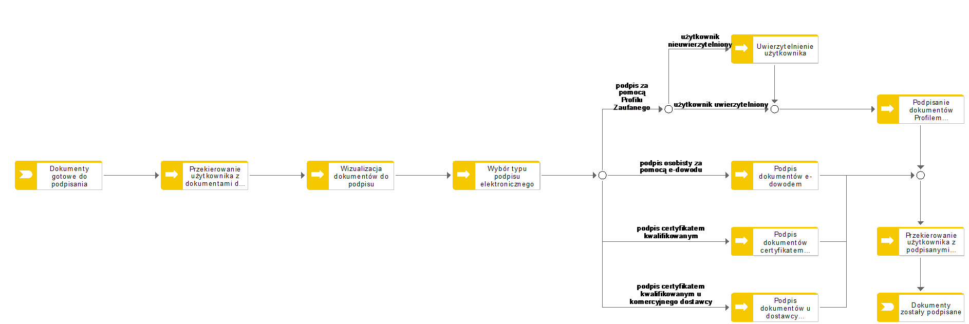 Przebieg procesu rozpoczyna się przekierowaniem użytkownika z dokumentami elektronicznymi do podpisania. System wizualizuje użytkownikowi dokumenty do podpisania i pozwala mu wybrać typ podpisu elektronicznego. Użytkownik podpisuje dokumenty zgodnie z wybranym typem. Podpisane dokumenty razem z użytkownikiem są przekierowywane do systemu, który zlecił podpis dokumentów lub innego, który będzie konsumentem podpisanych dokumentów.