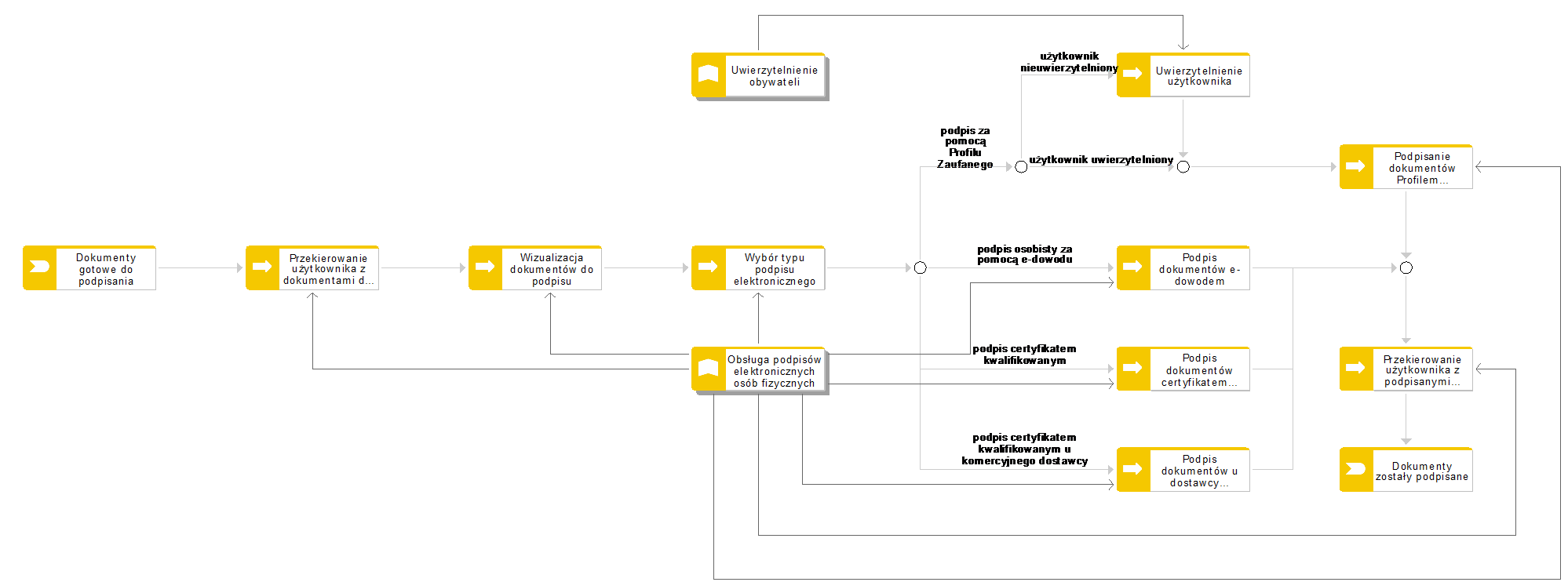 Przebieg procesu nie uwzględnia ścieżek alternatywnych obsługi wyjątków, np. gdy użytkownik nie ma założonego Profilu Zaufanego lub błędów komunikacji z czytnikiem kart kryptograficznych.