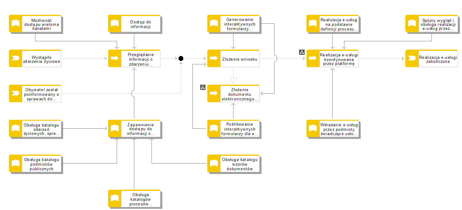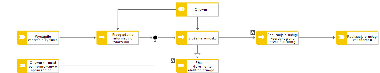 Przebieg procesu rozpoczyna się od wystąpienia zdarzenia życiowego. Obywatel w celu uzyskania informacji o obowiązkach i przywilejach (spraw) wynikających z wystąpienia zdarzenia życiowego szuka informacji o tym zdarzeniu. W przypadku gdy zdecyduje się skorzystać z e-usługi zapewniającej realizację sprawy (lub kilku spraw) związanych z danych zdarzeniem życiowym, zostaje przekierowany bezpośrednio do wybranej e-usługi na platformie. Obywatel całość procesu może zrealizować on-line. W odpowiednich narzędziach może złożyć wniosek, dokonać płatności – jeżeli usługa jej wymaga, a następnie obserwować realizację sprawy oraz - jeżeli zajdzie taka potrzeba - uzupełnić wniosek lub złożyć stosowne wyjaśnienia.