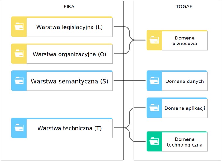 Architektura Informacyjna Państwa opiera się o EIRA (ang. European Interoperability Reference Architecture, https://www.gov.pl/web/ia/europejska-referencyjna-architektura-interoperacyjnosci). EIRA wykorzystuje język modelowania ArchiMate, który może być także stosowany w ramach prac opartych o TOGAF. Metodyka TOGAF zapewnia wsparcie dla różnych organizacji, w tym dla podmiotów administracji publicznej, w zakresie analizy i projektowania cyfrowych usług publicznych, wspierając interoperacyjność w fazie projektowania i rozwoju rozwiązań.