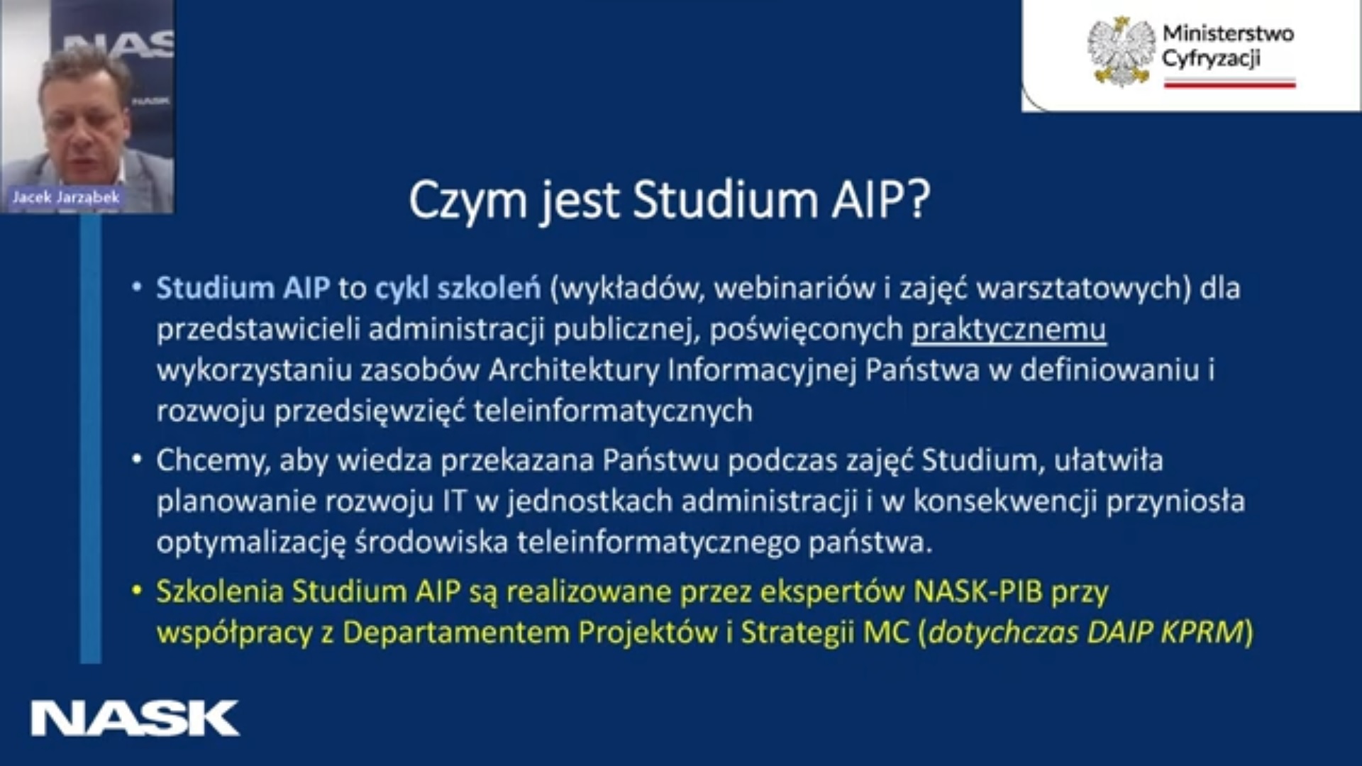 Celem przedsięwzięcia Studium AIP jest upowszechnienie wiedzy na temat zasobów informacyjnych Państwa opisanych w AIP i możliwości jej wykorzystania przy budowie nowych i optymalizacji istniejących rozwiązań teleinformatycznych administracji. I Edycja szkoleń skierowana jest do administracji rządowej.
