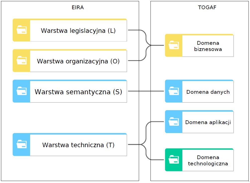- Domeny Aplikacji oraz Technologii TOGAF zawierają się w jednej warstwie Technicznej EIRA.