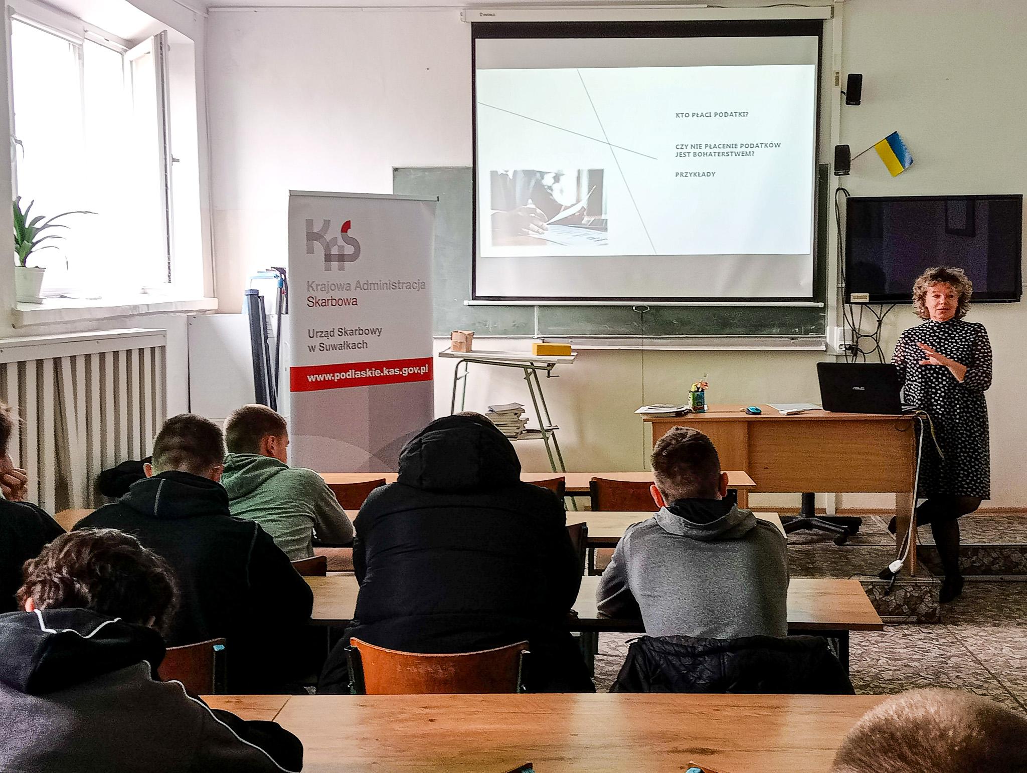 Pracownice Urzędu Skarbowego w Suwałkach - Teresa Bartosiewicz i Iwona Kaźmierczak odwiedziły uczniów w Zespole Szkół Technicznych w Suwałkach oraz w III Liceum Ogólnokształcącym z Oddziałami Dwujęzycznymi im. Alfreda Lityńskiego w Suwałkach. Łącznie podczas siedmiu spotkań obecnych było aż 170 uczniów klas trzecich.