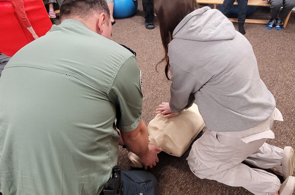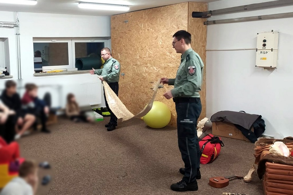 Ważnym punktem spotkania były zajęcia z pierwszej pomocy przedmedycznej. Funkcjonariusze przypomnieli zasady postępowania w sytuacji zagrożenia życia, utraty przytomności czy zadławienia. Dzieci wykazały się dużą wiedzą opowiadając, kogo należy powiadomić, jakie są numery alarmowe oraz jak zadbać o własne bezpieczeństwo.