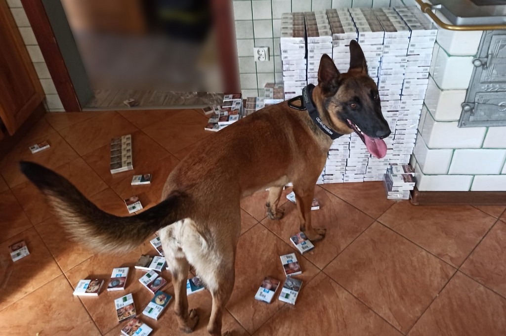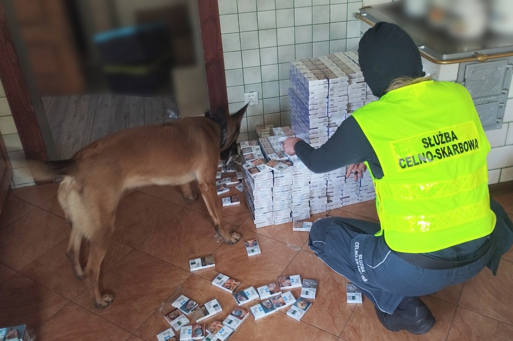 Podczas przeszukania domu mężczyzny mundurowi znaleźli 6365 paczek papierosów pochodzących z przemytu. Kontrabanda była ukryta m.in. w kotłowni oraz w skrytkach w schodach i w ścianie między pokojami. W przeszukaniach funkcjonariuszy wspierała Hiena, owczarek belgijski wyszkolony do wykrywania wyrobów tytoniowych.