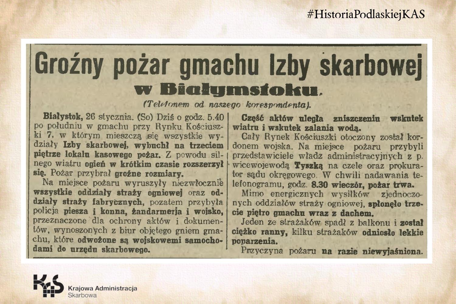 - Wielu białostoczan już spało kiedy 26 stycznia 1929 roku w budynku przy Rynku Kościuszki 7 gdzie mieściła się Izba Skarbowa wybuchł groźny pożar