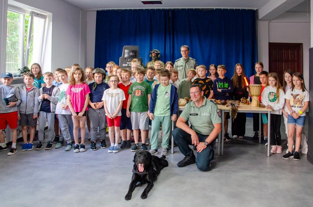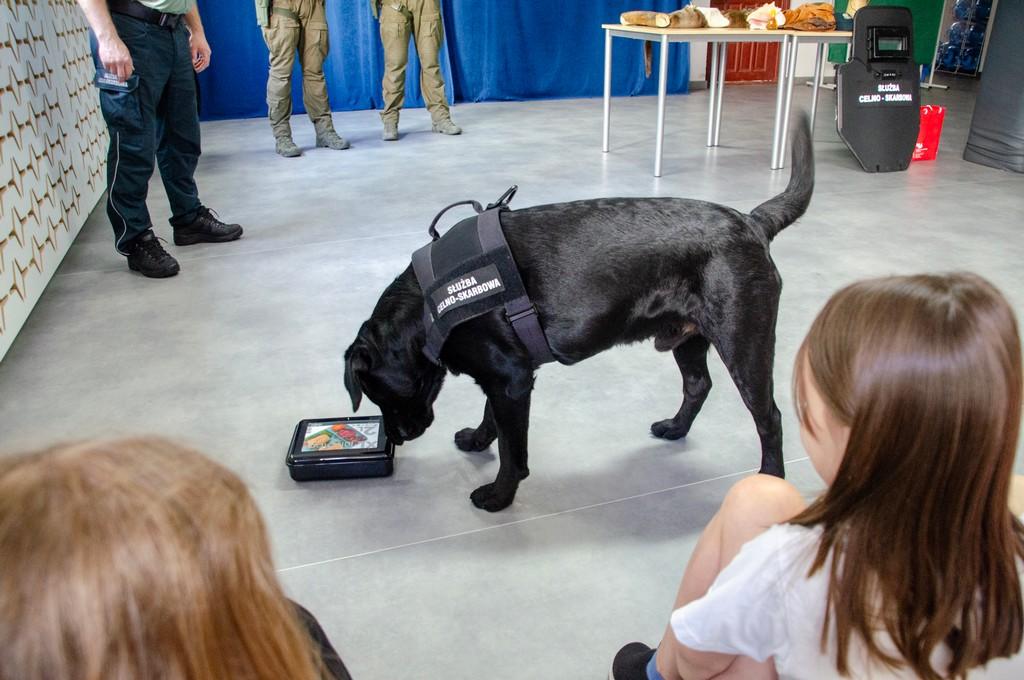 Największą atrakcją dla dzieci był jednak służbowy labrador Piorun, który zaprezentował swoje umiejętności w wyszukiwaniu tytoniowej kontrabandy. Po pokazie czworonożny specjalista dumnie zapozował z uczniami do wspólnego zdjęcia.