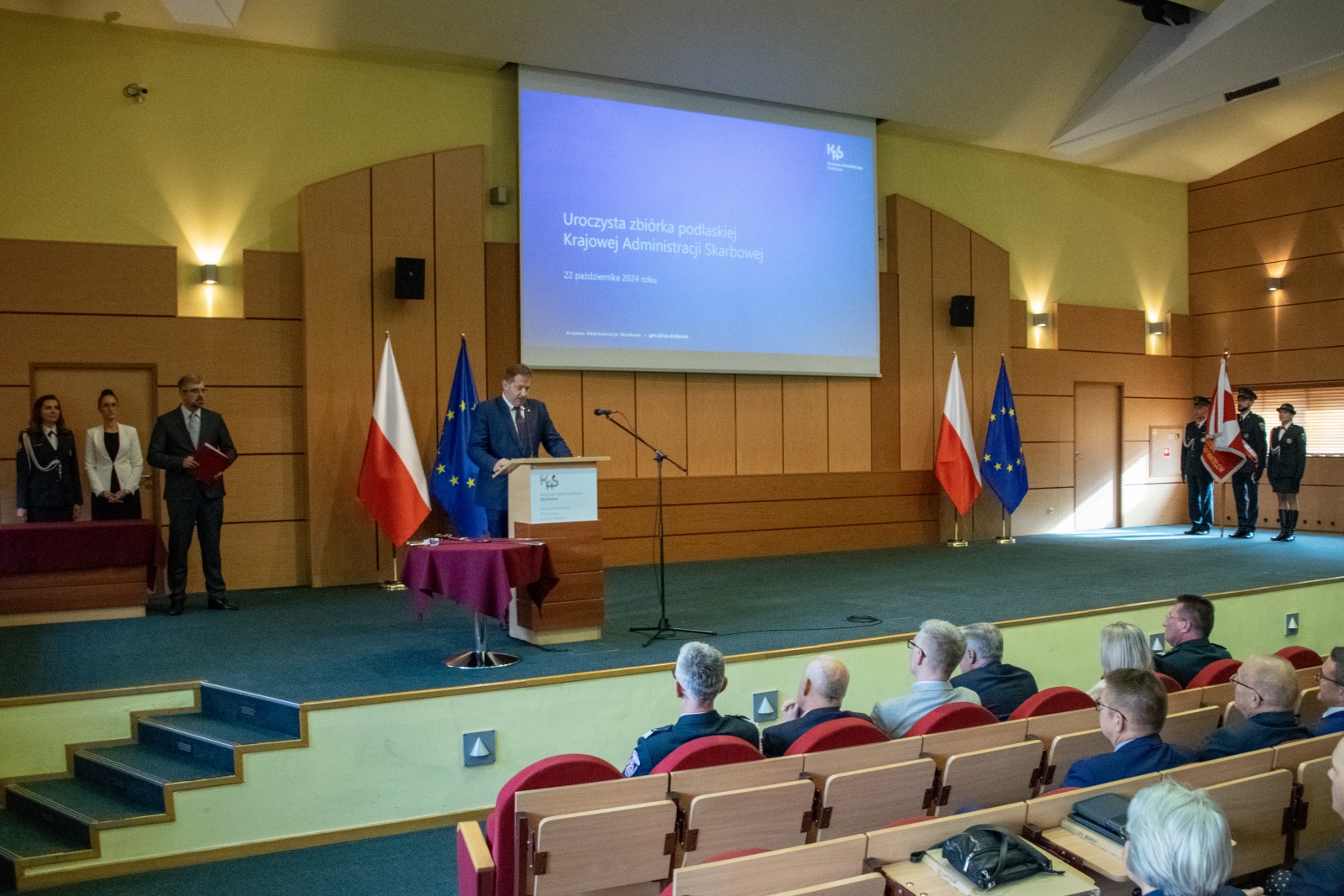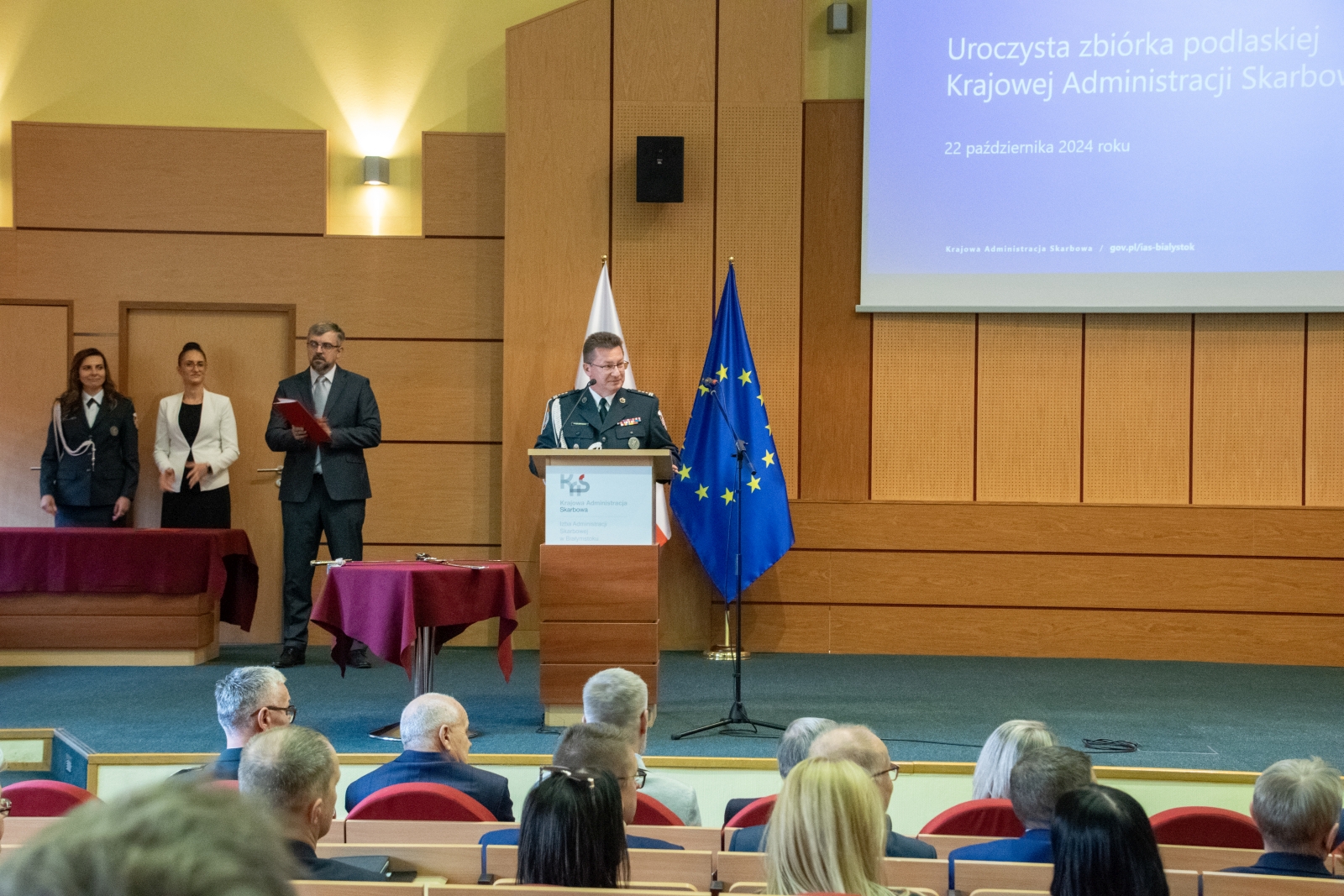 Zaproszonych gości przywitał Dyrektor Izby Administracji Skarbowej (IAS) w Białystoku insp. Piotr Szczepaniak. W uroczystej zbiórce wzięli udział m.in. Sekretarz Stanu w Ministerstwie Finansów, Szef KAS Marcin Łoboda, Wicewojewoda Podlaski Paweł Krutul, Zastępca Prezydenta Miasta Białegostoku Eliza Cybulko oraz przedstawiciele podlaskich służb mundurowych.