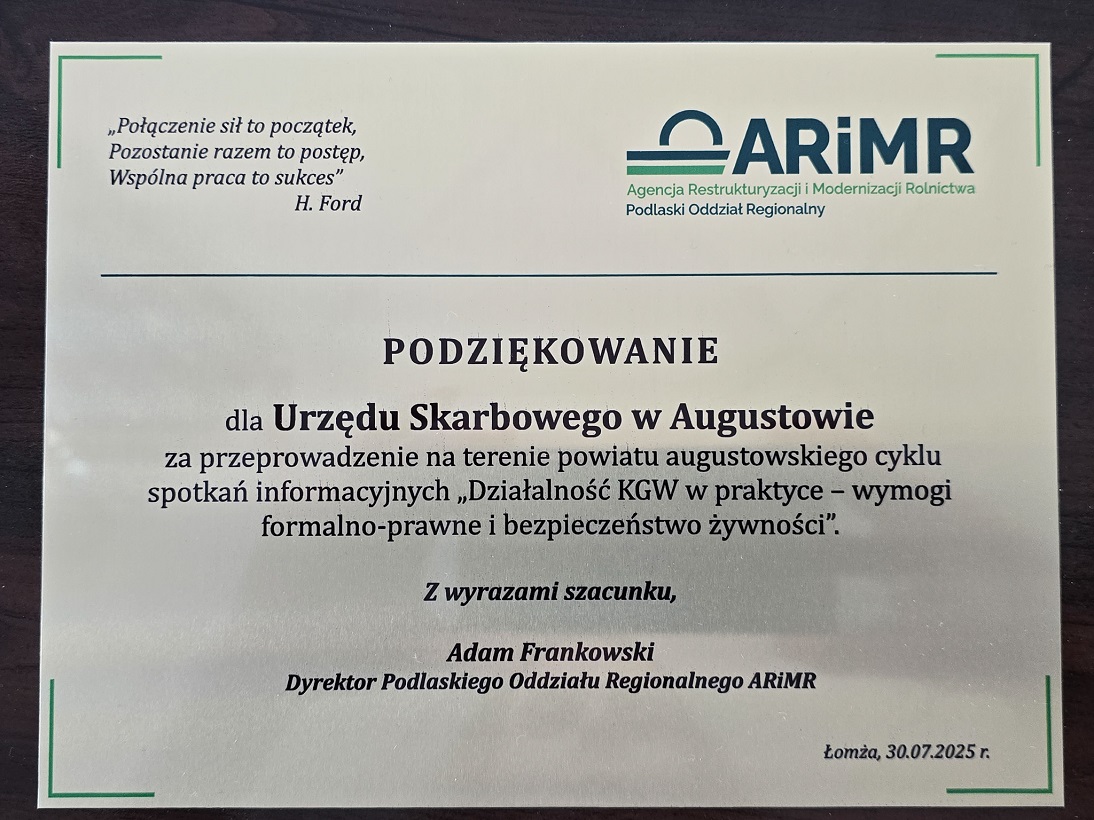 - Podczas prelekcji o kluczowych zagadnieniach dotyczących obowiązków podatkowych KGW, eksperci podlaskiej Krajowej Administracji Skarbowej (KAS) otrzymali podziękowania za współpracę i zaangażowanie w organizację szkoleń.