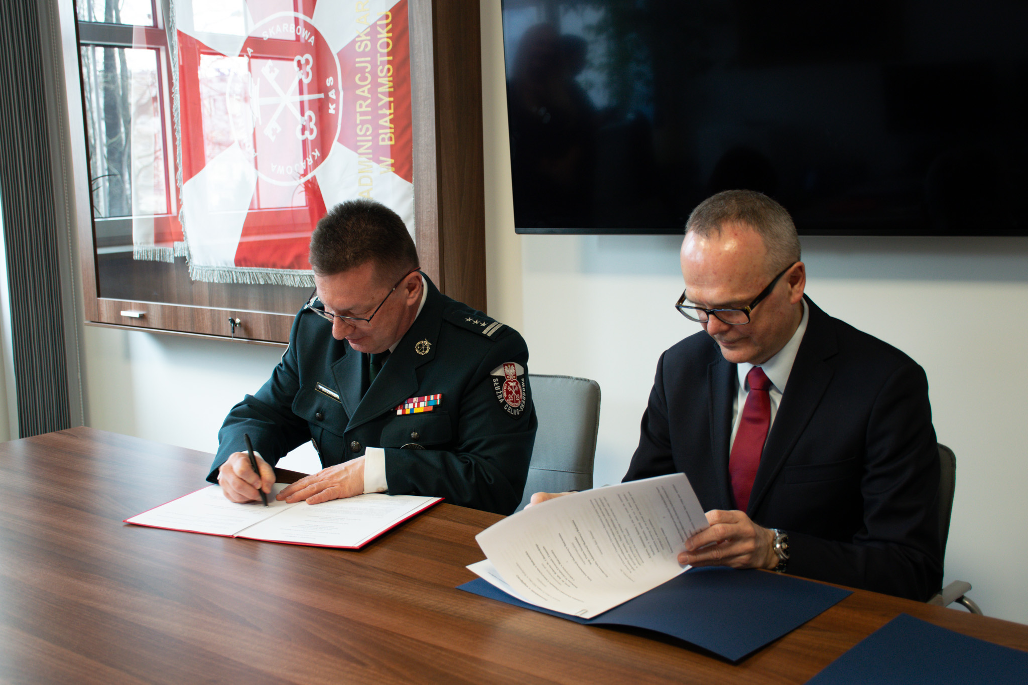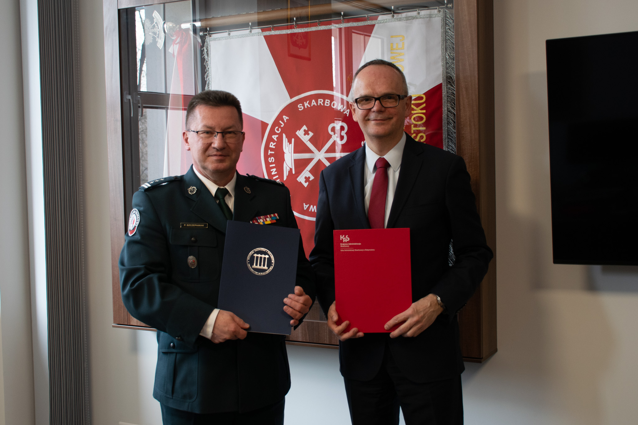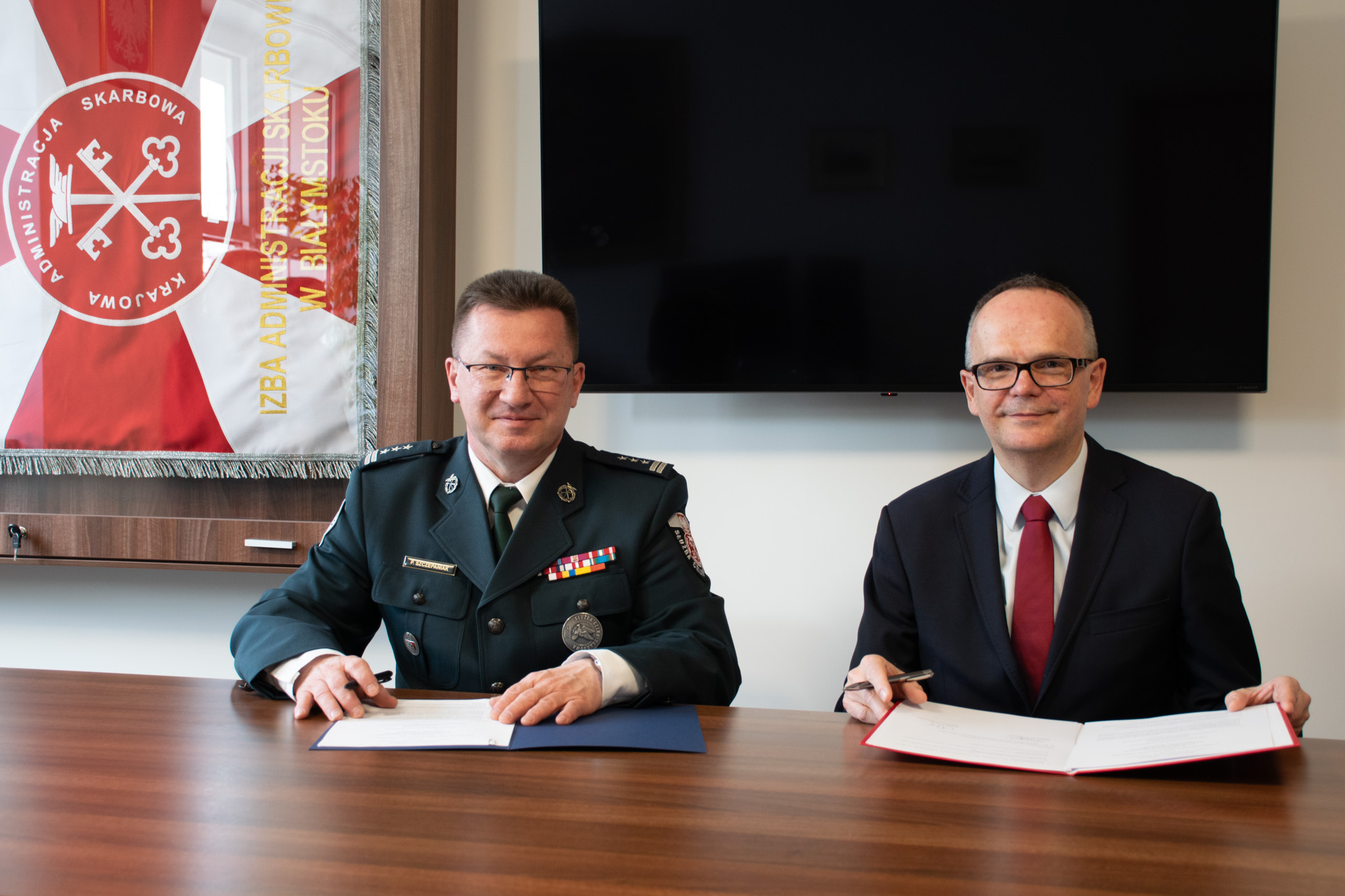 Zawarte porozumienie podpisali insp. Piotr Szczepaniak, Dyrektor Izby Administracji Skarbowej w Białymstoku oraz prof. dr hab. Robert W. Ciborowski, Dziekan Wydziału Ekonomii i Finansów Uniwersytetu w Białymstoku.