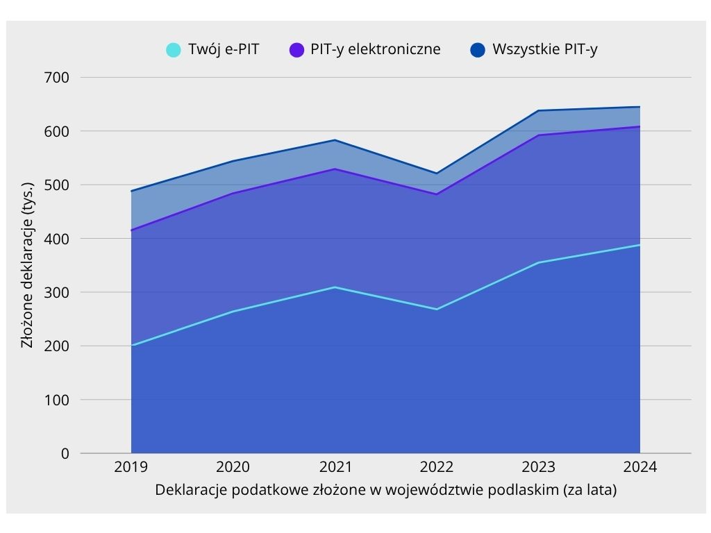 - Podatnicy woj. podlaskiego złożyli elektronicznie prawie 608 tys. deklaracji podatkowych za 2024 r. (94 proc. wszystkich deklaracji), z czego większość, bo aż 388 tys. przez usługę Twój e-PIT.