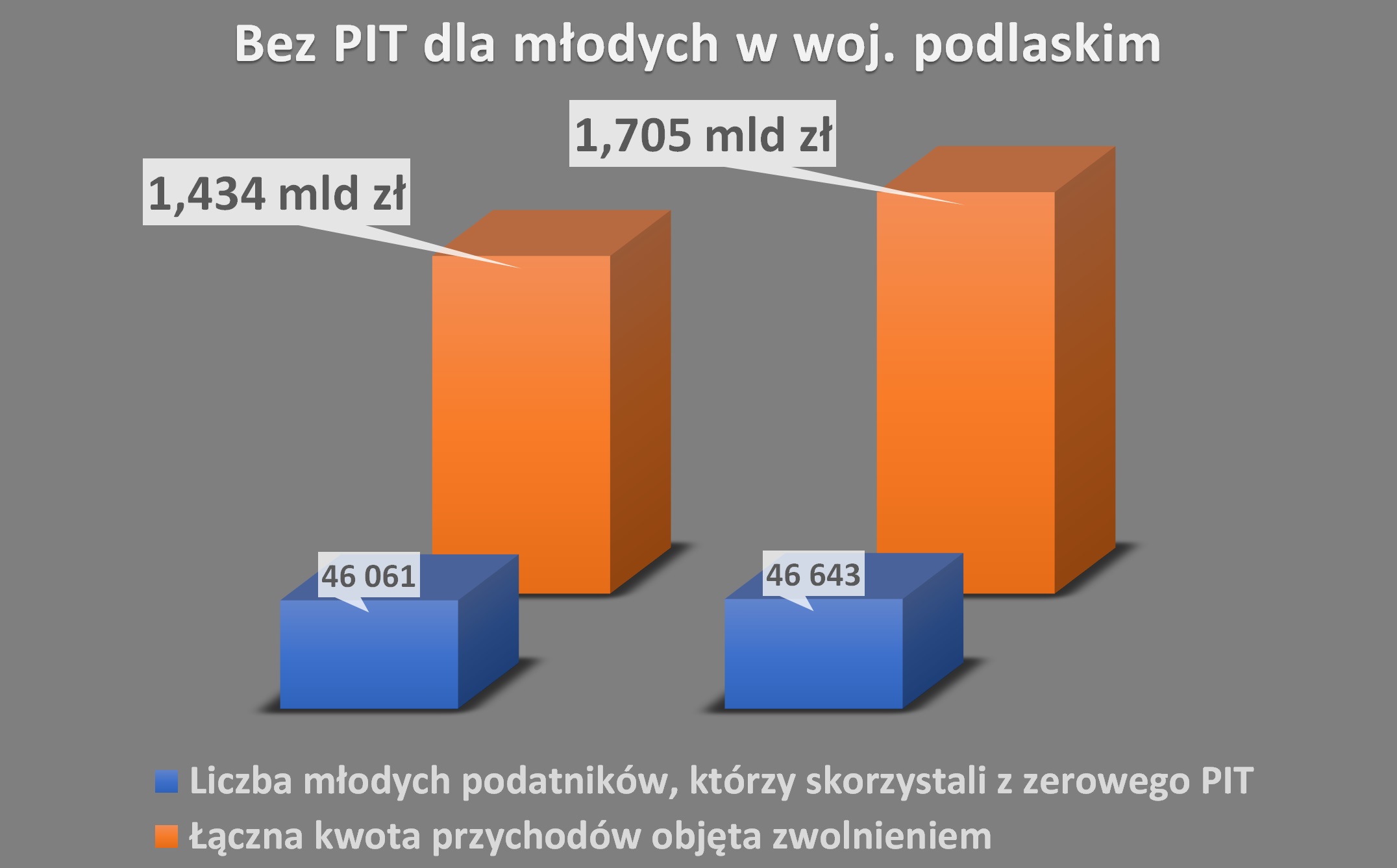 Z zerowego PIT-u, czyli zwolnienia z opodatkowania wynagrodzeń skorzystało w tym roku 46 643 młodych podatników, którzy nie ukończyli 26 roku życia i osiągnęli przychody z pracy (czyli ze stosunku pracy, spółdzielczego stosunku pracy, stosunku służbowego lub stosunku pracy nakładczej) oraz z umów zleceń. Łączna kwota przychodu „młodych” podatników objęta w 2024 roku tym zwolnieniem to prawie 1,705 mld zł. Oznacza to, że od takiej kwoty osoby objęte zwolnieniem „Bez PIT dla młodych” nie zapłaciły podatku PIT.