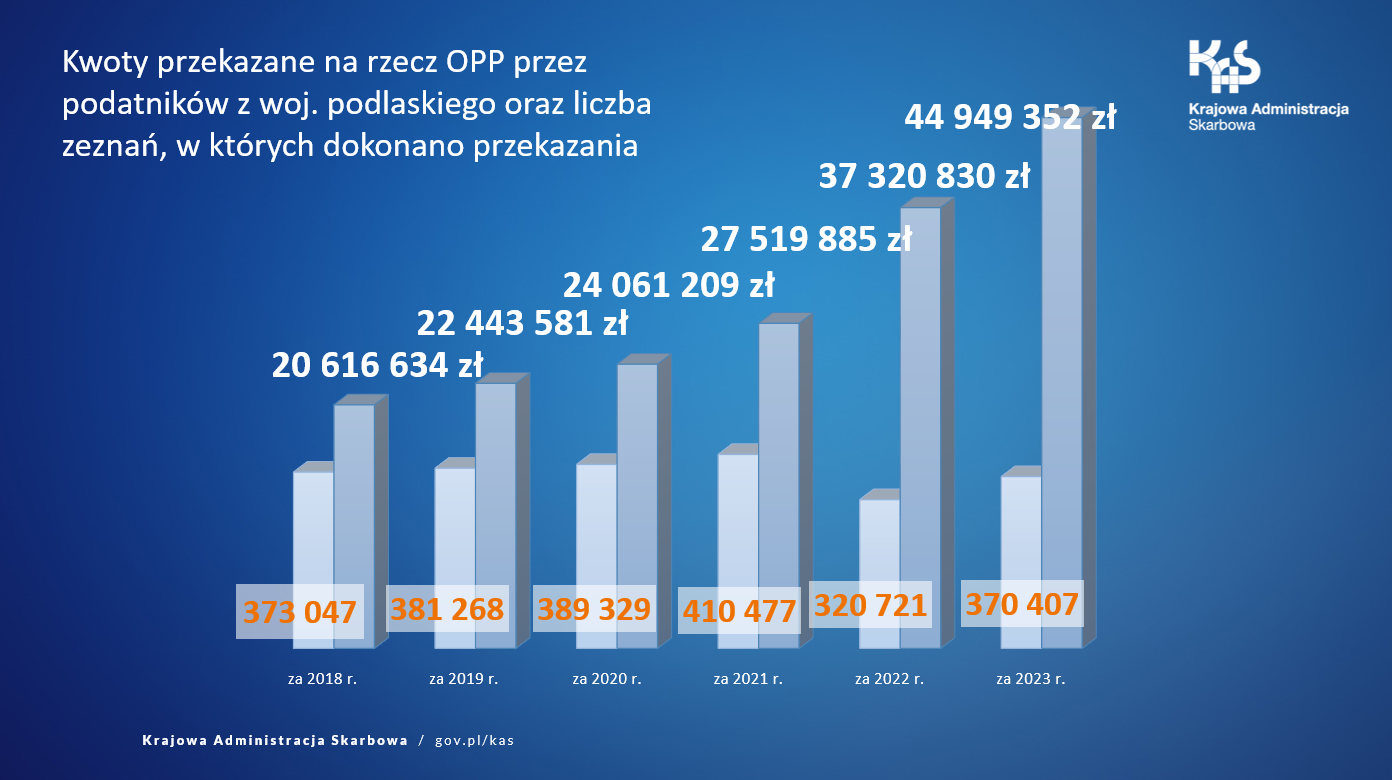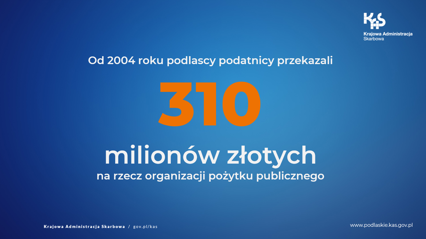 Łącznie, od momentu kiedy w 2004 r. po raz pierwszy pojawiła się możliwość przekazywania organizacjom pożytku publicznego 1 proc. naszego podatku (aktualnie 1,5%), OPP otrzymały od mieszkańców woj. podlaskiego 310 mln zł.