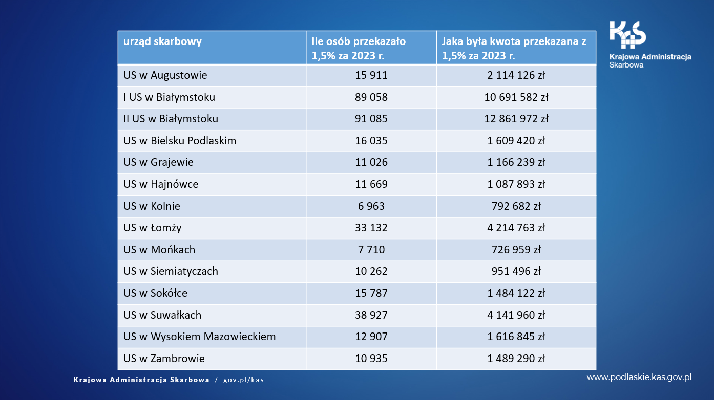 Coroczne podsumowanie kampanii PIT, które sporządza podlaska Krajowa Administracja Skarbowa, dostarcza także danych dotyczących kwot przekazanych przez podatników w ramach 1,5 proc. podatku na rzecz OPP. W zeznaniach za 2023 r. podatnicy po raz kolejny zadeklarowali rekordową kwotę odpisu 1,5 proc. na rzecz OPP.