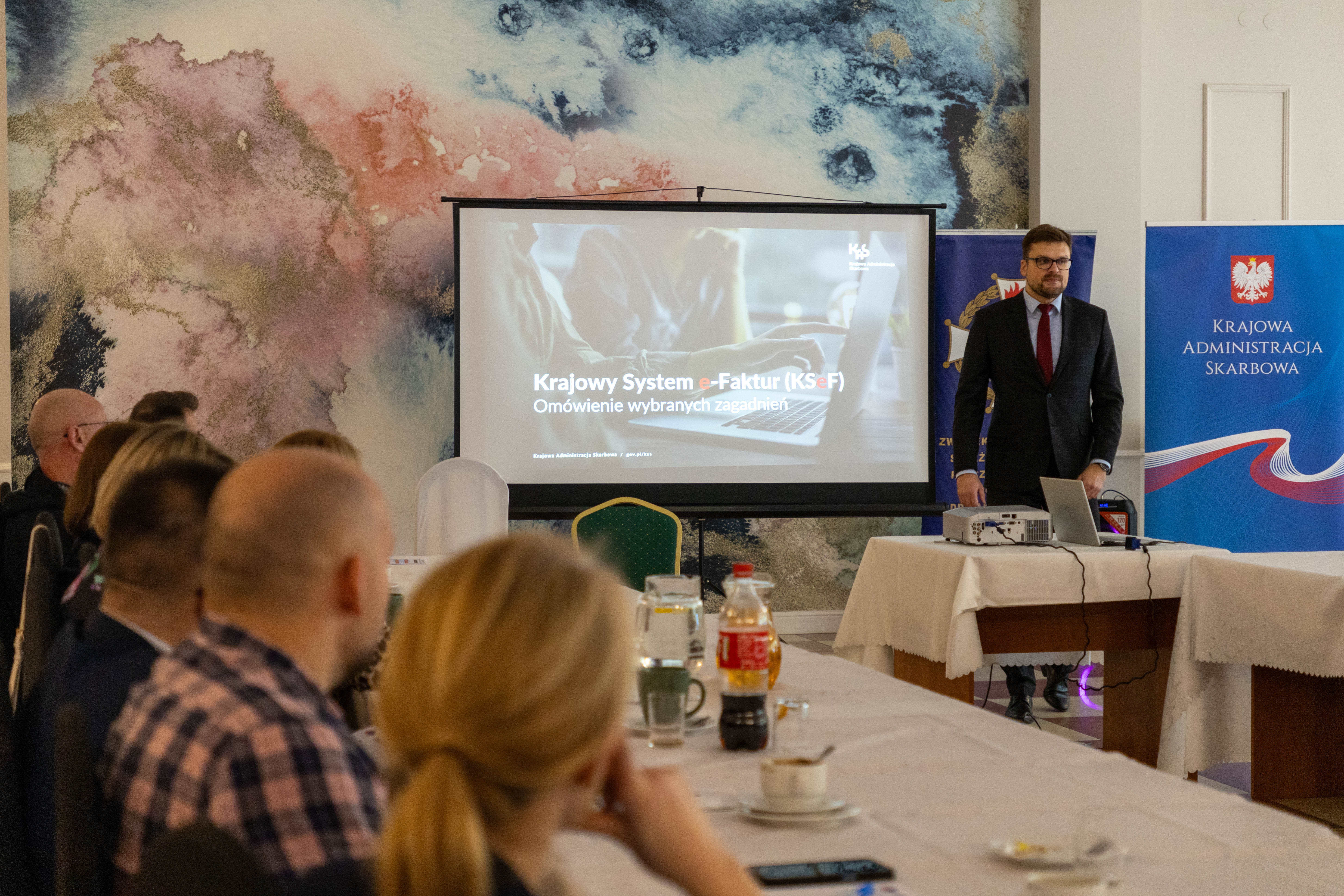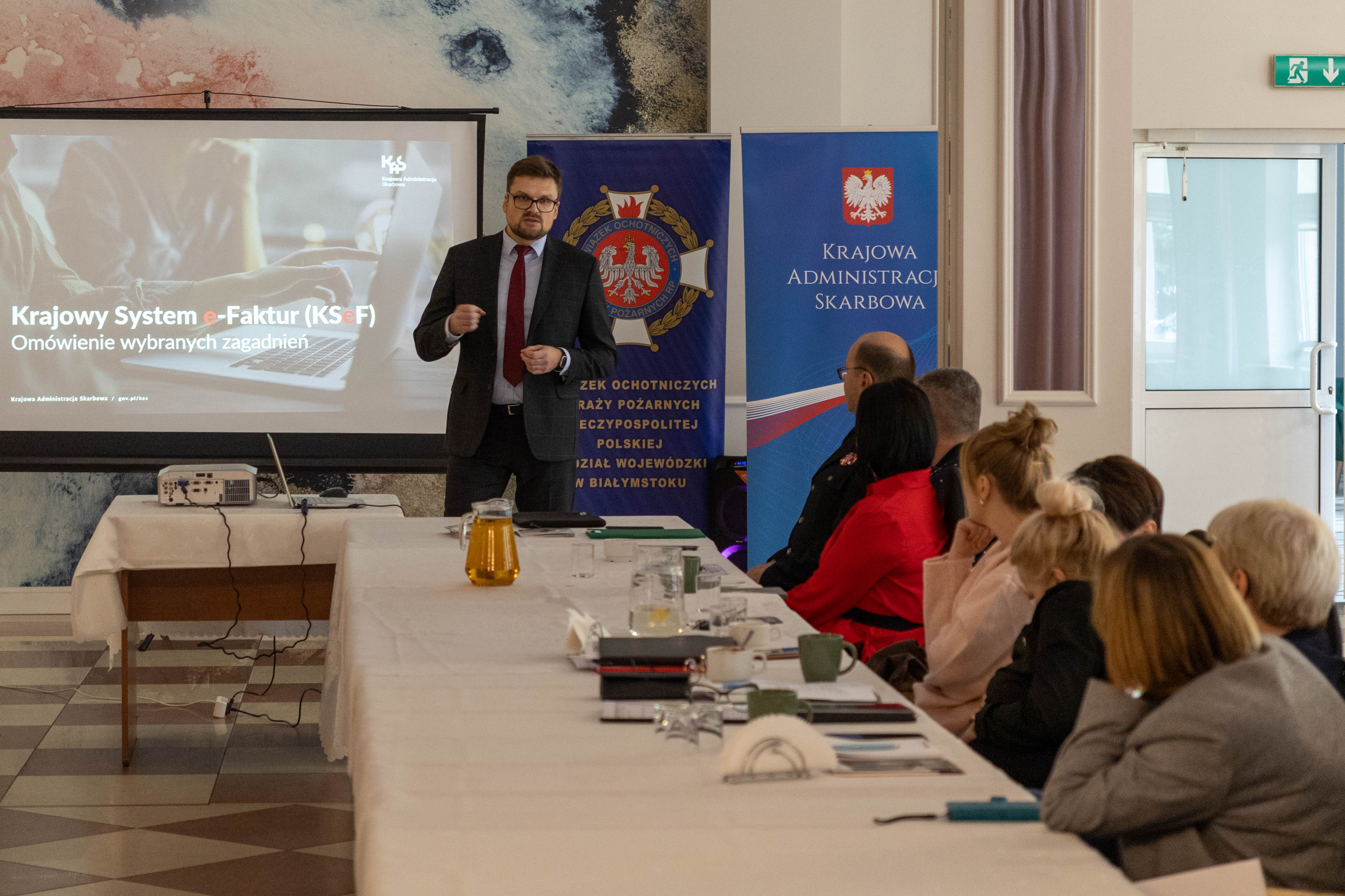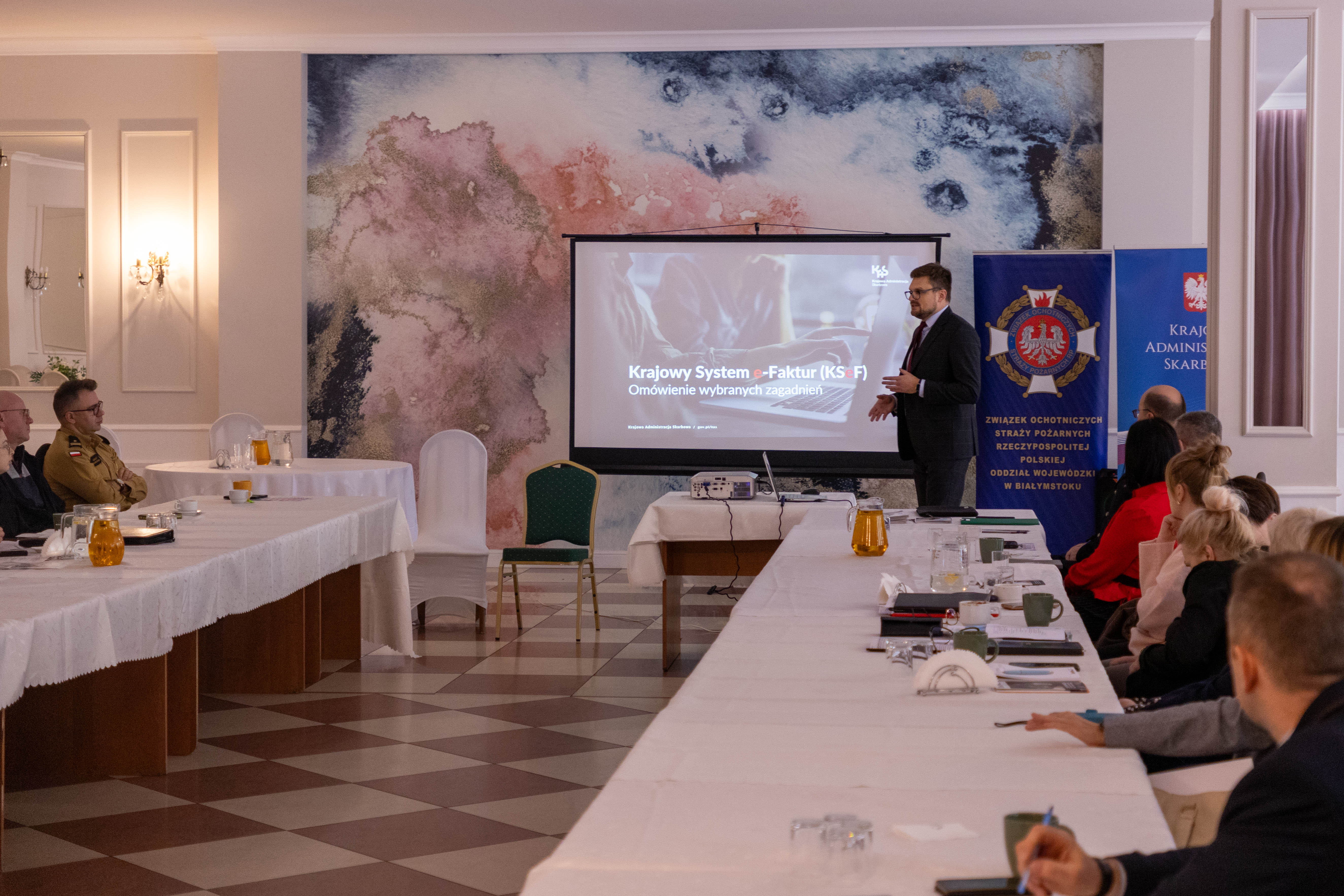 Ponadto ekspert KAS, którym był Pan Jacek Juszkiewicz, Zastępca Naczelnika Pierwszego Urzędu Skarbowego w Białymstoku, przybliżył zebranym zasady funkcjonowania Krajowego Systemu e-Faktur, a także omówił, w jaki sposób OSP mogą dostosować się do przepisów dotyczących fakturowania elektronicznego.