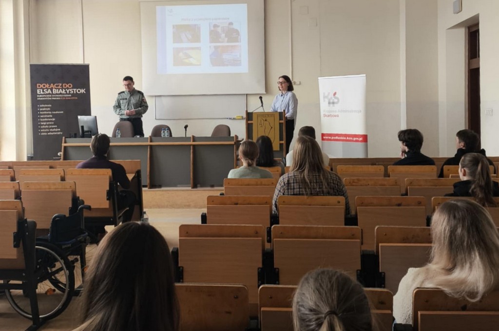 W środę 26 marca, na zaproszenie ELSA w Białymstoku, przedstawiciele podlaskiej KAS spotkali się ze studentami Wydziału Prawa UwB. Prelegenci z Izby Administracji Skarbowej (IAS) w Białymstoku opowiedzieli zgromadzonym m.in. o zadaniach i strukturze KAS oraz roli Służby Celno-Skarbowej w ochronie finansowych interesów Polski i Unii Europejskiej.
