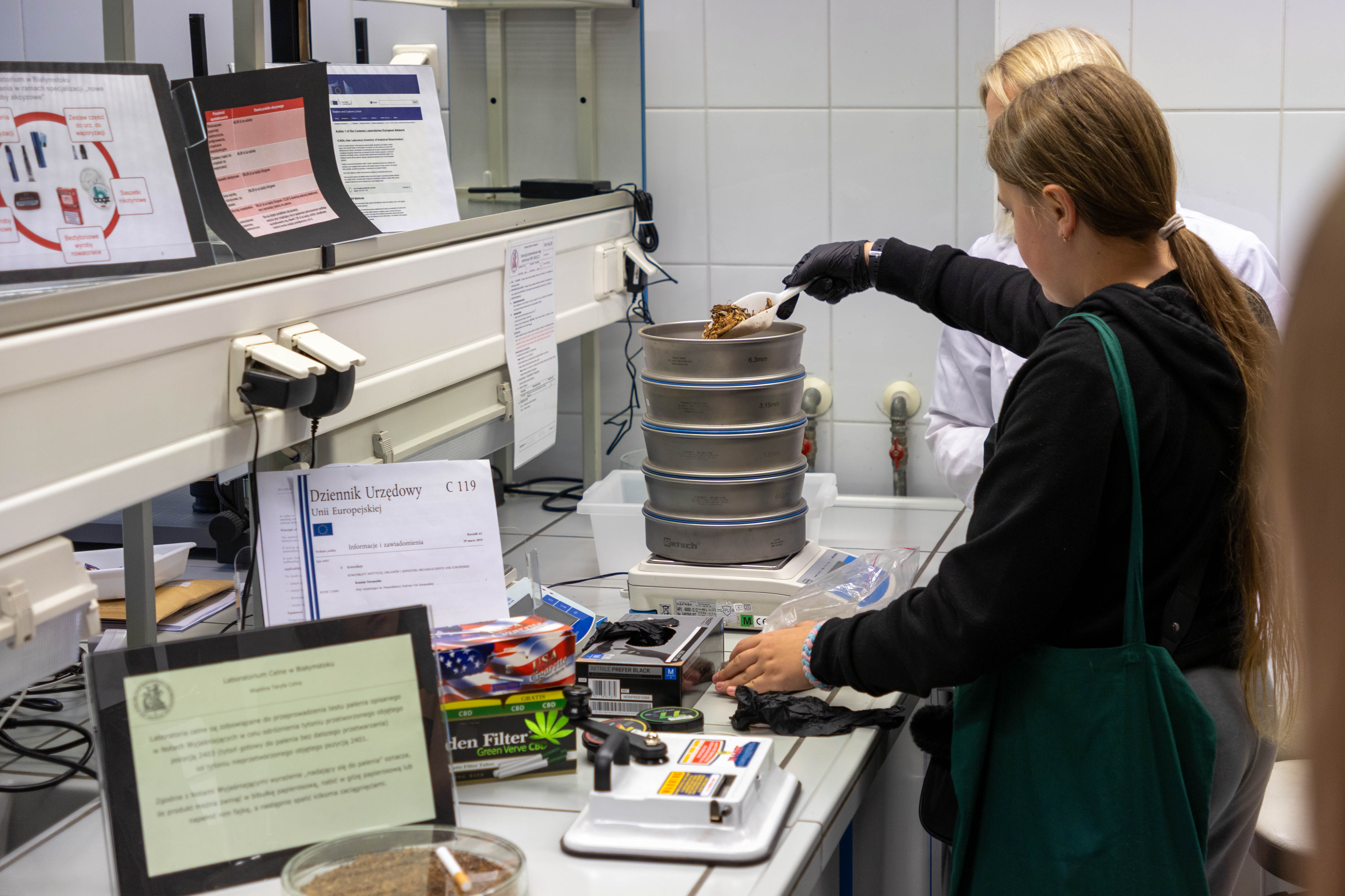 W Laboratorium Celnym uczniowie mogli w praktyce doświadczyć pracy badawczej. Pod okiem specjalistów obserwowali, jak przeprowadza się badania substancji chemicznych czy tytoniu. Mogli zobaczyć zaawansowany sprzęt analityczny i dowiedzieć się, jak kluczowe są te badania dla wykrywania nielegalnych substancji i podróbek.