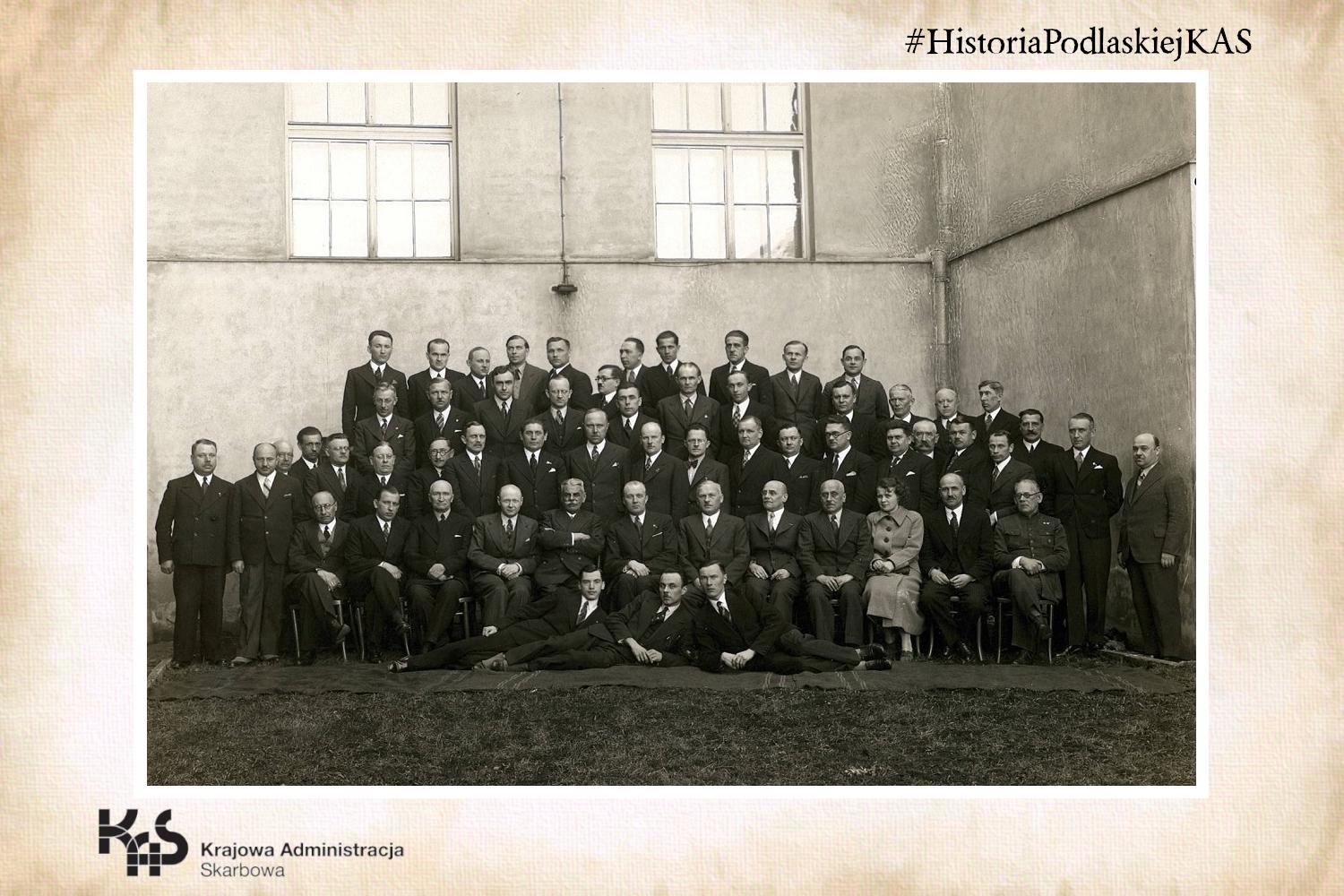 Drugie zdjęcie przedstawia pracowników Izby Skarbowej wraz z jej prezesem – dr. Adamem Piaseckim, który funkcję prezesa pełnił w latach 1932 – 1936, a następnie 17 listopada 1936 roku przeniesiony został na stanowisko prezesa Izby Skarbowej w Nowogródku.