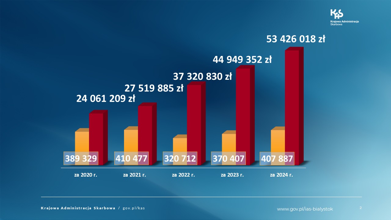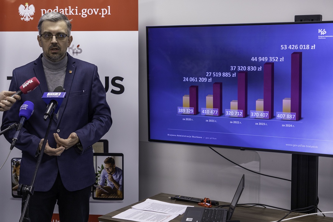 W poprzednim roku, kiedy rozliczaliśmy się za 2024 r., ponad 407 tys. podatników z woj. podlaskiego zdecydowało się przekazać 1,5 proc. swojego podatku na rzecz OPP. Liczba darczyńców była o 37 tys. większa niż rok wcześniej. Z kolei kwota przekazana na OPP w PITach za 2024 rok była rekordem wszechczasów. W zeznaniach za 2024 r. podatnicy z woj. podlaskiego zadeklarowali bowiem odpis na rzecz OPP w łącznej wysokości prawie 53,5 mln zł, podczas, gdy roku wcześniej było to 45 mln zł.