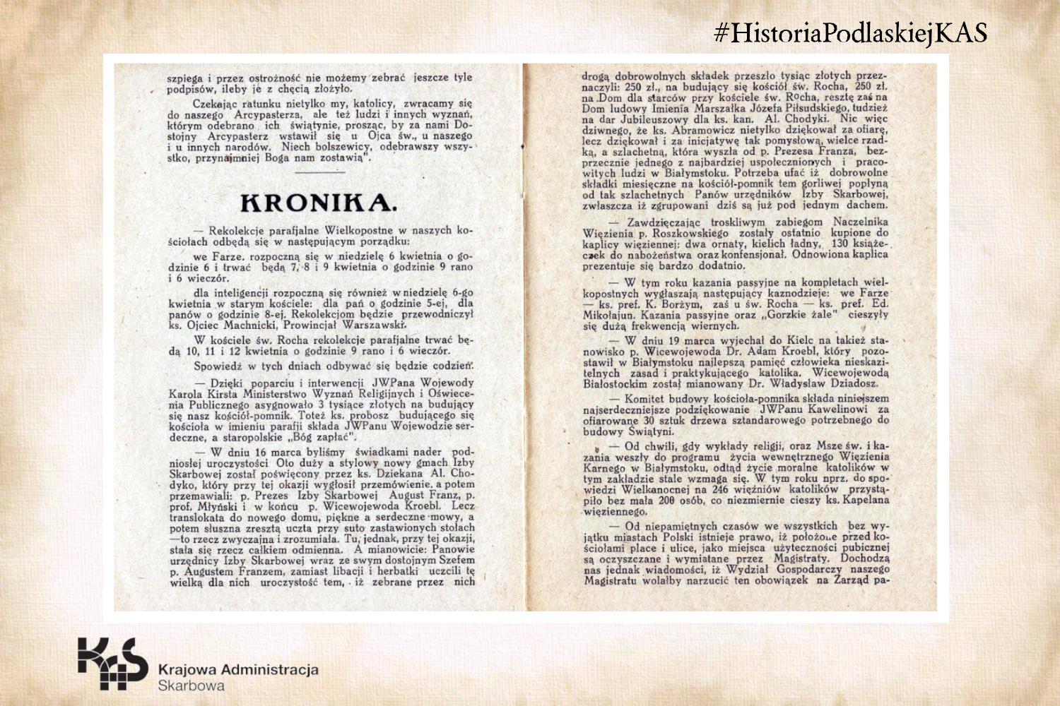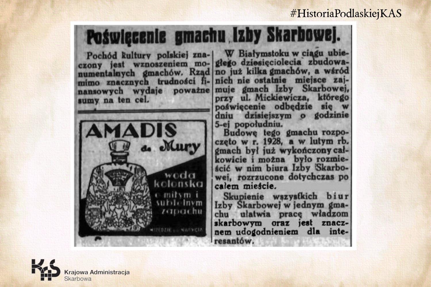 - 16 marca 1930 roku odbyło się uroczyste otwarcie i poświęcenie nowo wybudowanej siedziby Izby Skarbowej w Białymstoku.
