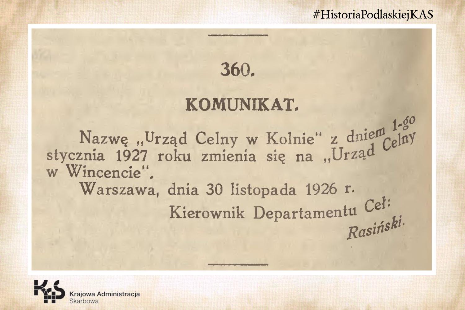 Od 1922 roku Urząd Celny w Kolnie (Wincencie) podlegał Dyrekcji Ceł w Warszawie, która swym zasięgiem objęła obszar województwa białostockiego. Z początkiem 1927 roku usankcjonowano stan faktyczny i Urząd Celny w Kolnie przemianowano na Urząd Celny w Wincencie. Trzy lata później, w związku z wzrastającym ruchem towarowym, zdecydowano o nadaniu mu uprawnień urzędu I klasy w wywozie.