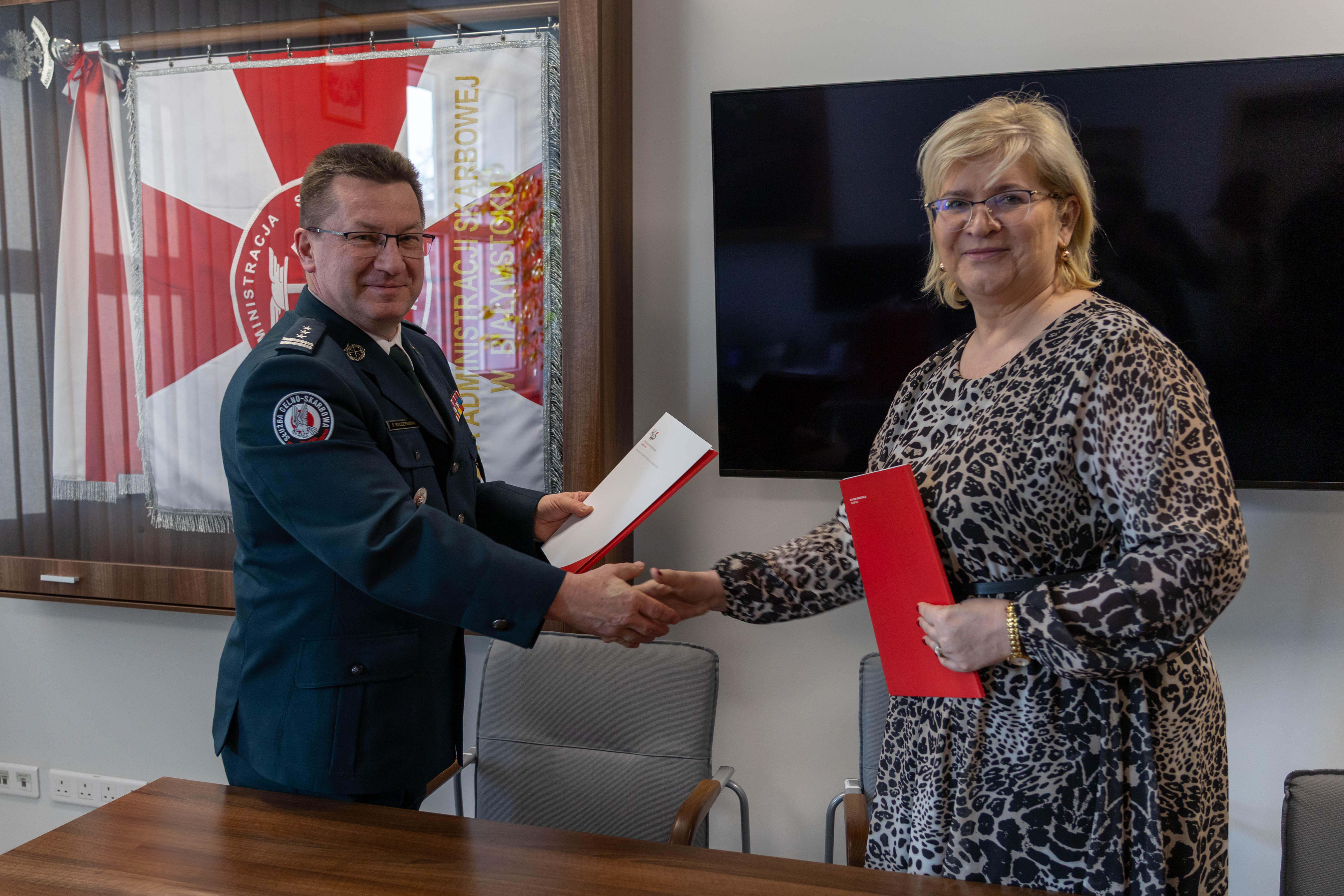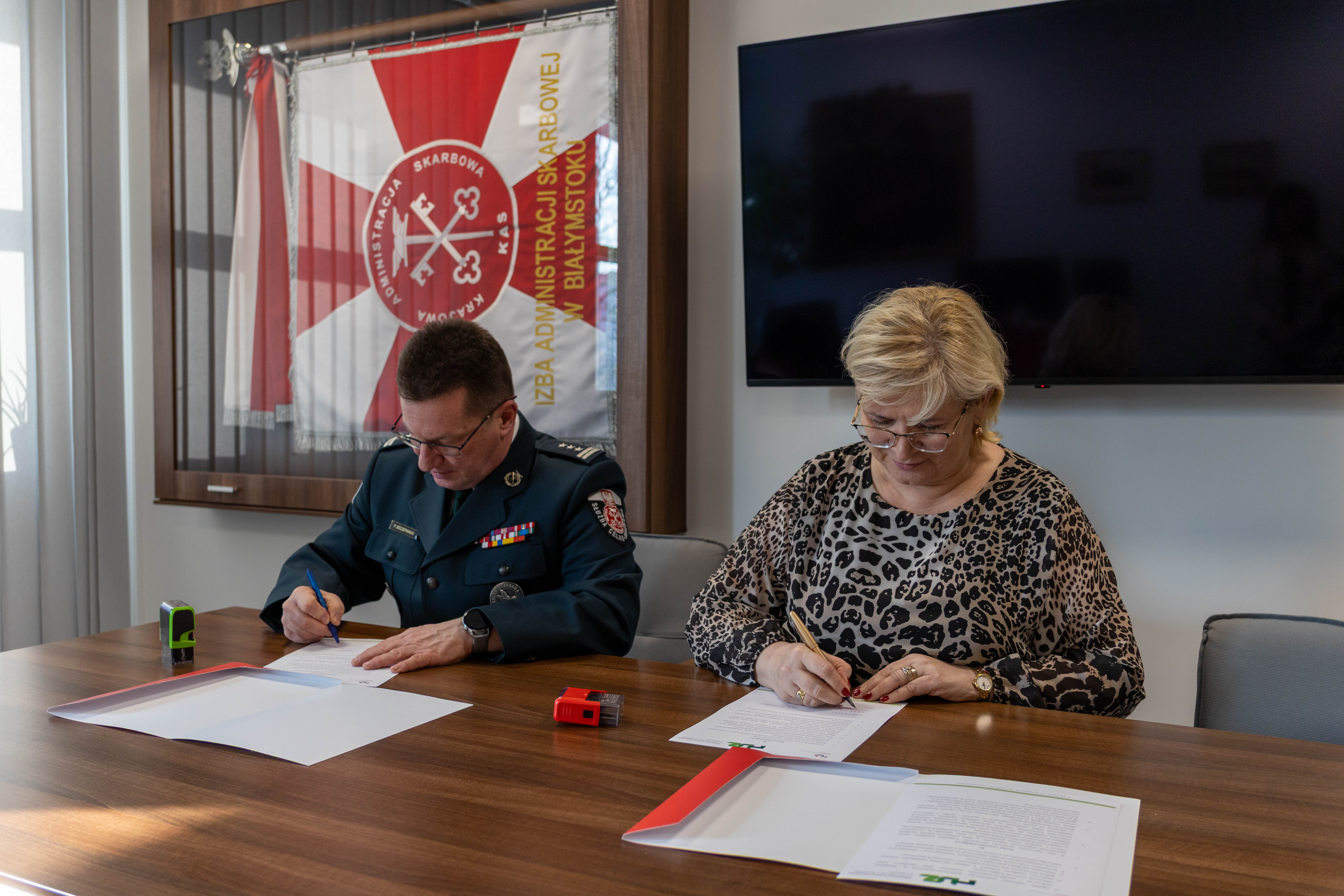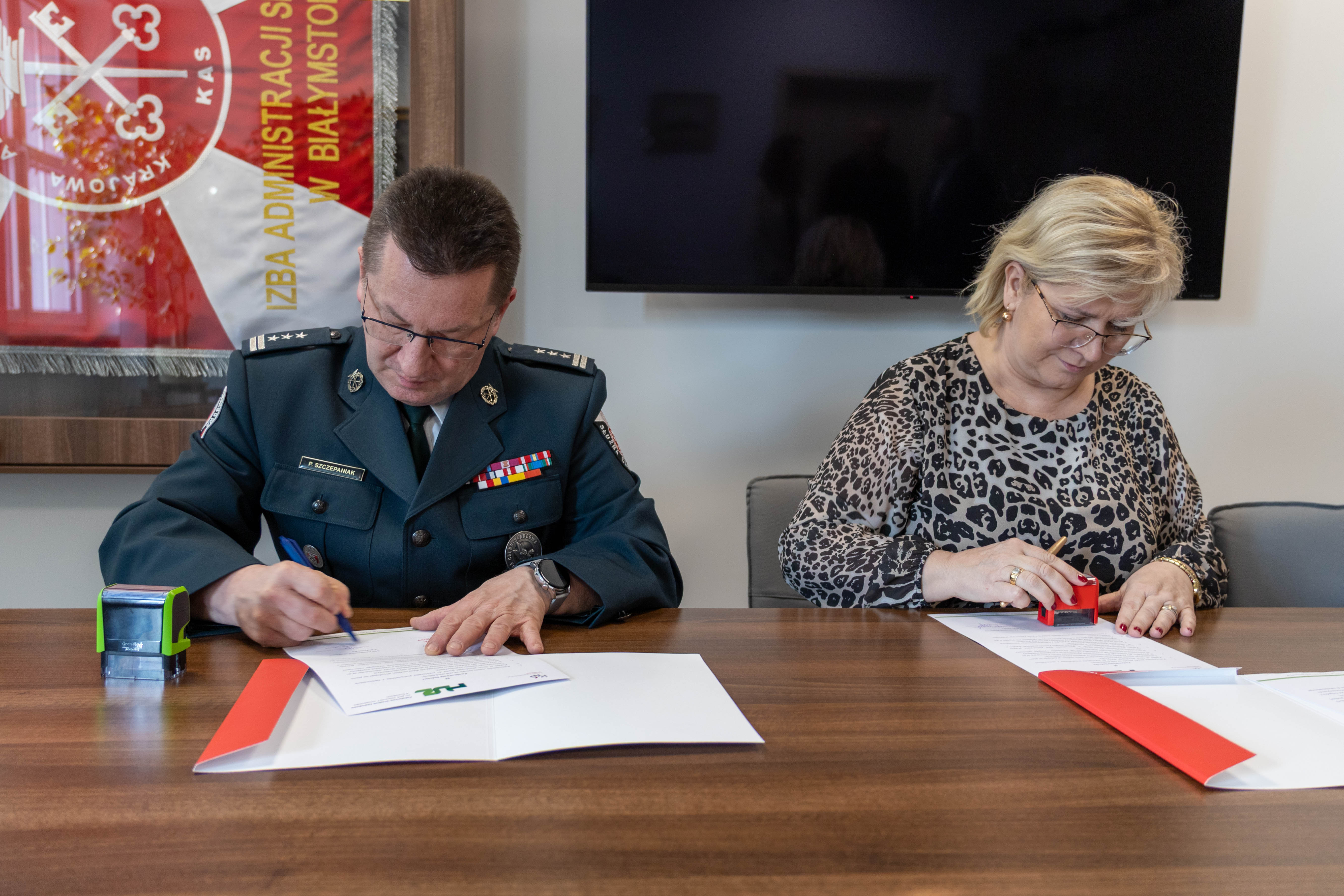 Porozumienie sygnowali insp. Piotr Szczepaniak, Dyrektor Izby Administracji Skarbowej (IAS) w Białymstoku oraz dr n. o zdr. Małgorzata Andryszczyk, prof. PUZ w Suwałkach.