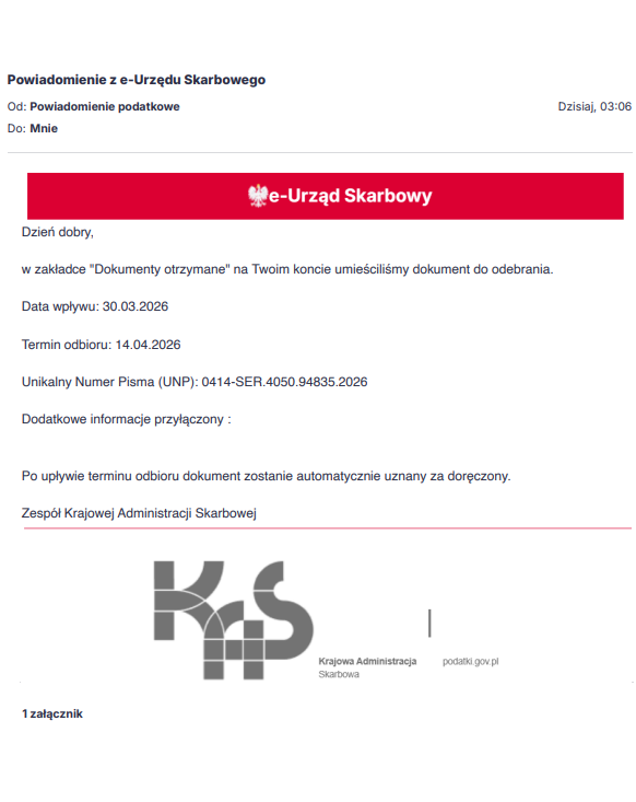 - Wiadomości zawierają informacje o otrzymaniu dokumentu na twoim koncie w serwisie e-Urząd Skarbowy.
