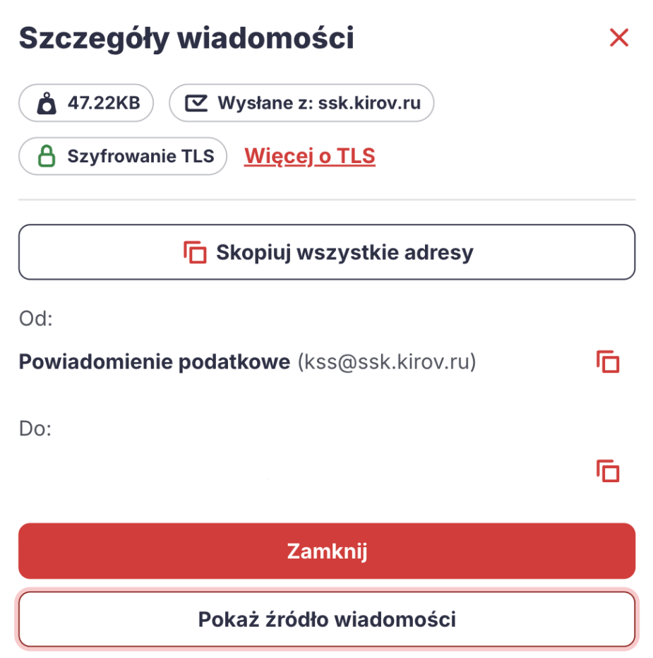 Adresy nadawców nie są adresami e-mail Krajowej Administracji Skarbowej np. kss@ssk.kirov.ru.
