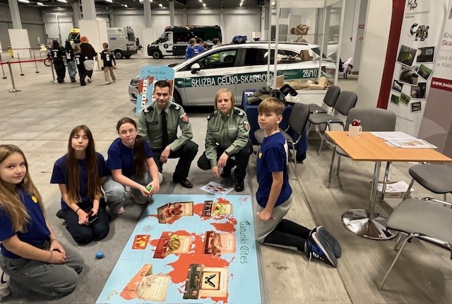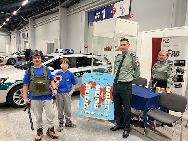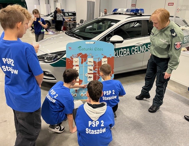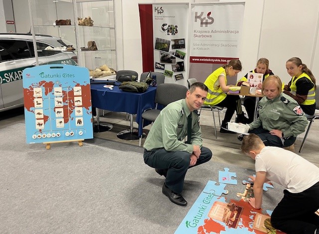 Stoisko świętokrzyskiej KAS cieszyło się bardzo dużym zainteresowaniem. Przygotowaliśmy ciekawą wystawę okazów CITES (wyroby z gatunków chronionych zagrożonych wyginięciem), tj.: koralowce, skóry z węży i wilka szarego, torebki i portfele z krokodyla, paski czy buty ze skór węży. Młodzież mogła obejrzeć również muszle przydaczni czy figurki z kości słoniowej. Wszystkie prezentowane przedmioty zostały odebrane turystom przy próbie przemytu przez granicę. Dzieci z ciekawością słuchały o ochronie dziko żyjących gatunków flory i fauny oraz próbach ich przemytu. Chłopcy chętnie przymierzali kamizelkę kuloodporną i hełm służby celno-skarbowej. Przy stoisku dzieci mogły poznać pracę i służbę w KAS poprzez rozwiązywanie rebusów, krzyżówek i zagadek. Nagrodą były gadżety z logo KAS.