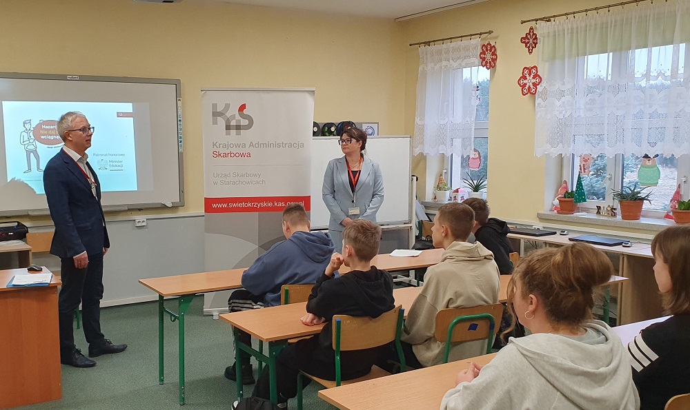 Natomiast 12 grudnia pracownicy Urzędu Skarbowego w Starachowicach, z lekcją na temat „Hazard? Nie daj się wciągnąć!”, odwiedzili uczniów klasy VII i VIII w Szkole Podstawowej w Adamowie.