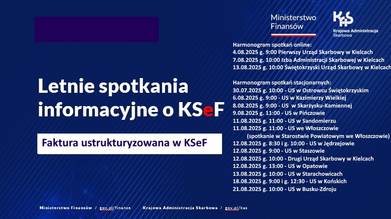 - Spotkania informacyjne o KSeF będą odbywać się w lokalnych urzędach skarbowych województwa świętokrzyskiego oraz w Izbie Administracji Skarbowej w Kielcach, przez okres wakacyjny co dwa tygodnie.