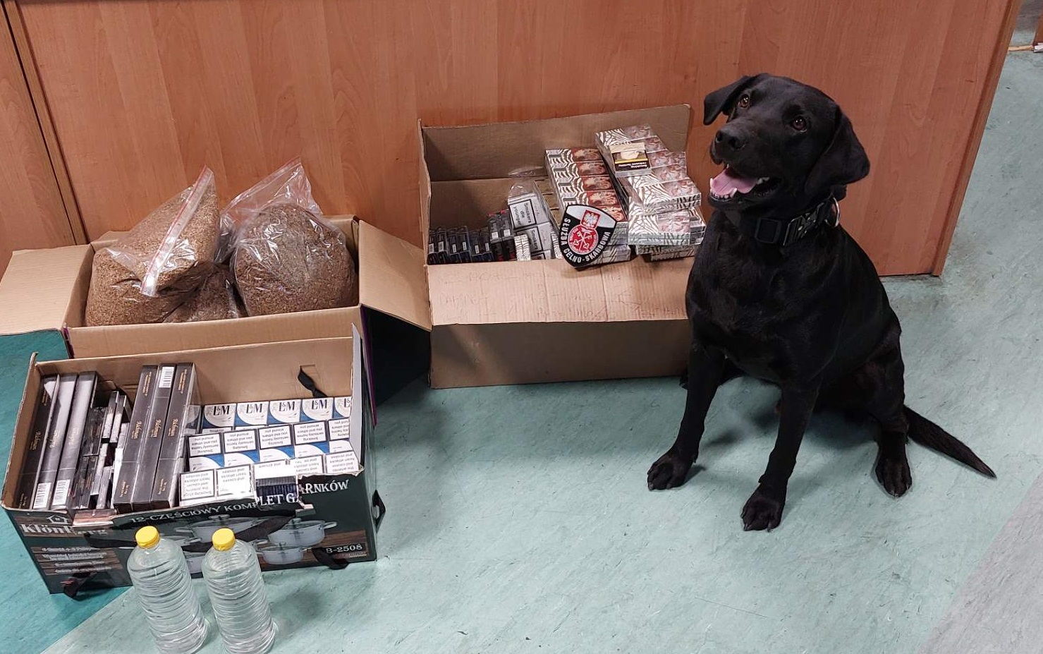 Znaleźli 5,5 kg tytoniu do palenia oraz 701 szt. paczek papierosów różnych marek bez polskich znaków akcyzy. W czynnościach pomocny był pies służbowy Nero. Właścicielem stoiska handlowego i sprzedawcą okazał się 60-letni Polak. Oprócz papierosów i tytoniu funkcjonariusze znaleźli jeszcze ukryte dwie butelki z cieczą (ok. 1,8 l) o charakterystycznym zapachu alkoholu.