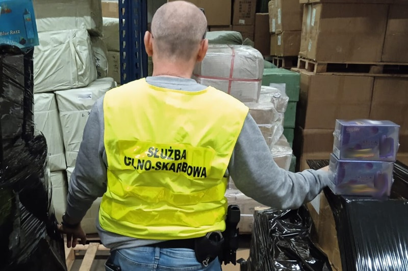 29 246 szt. e-papierosów i 789490 ml płynów do e-papierosów funkcjonariusze zabezpieczyli na jednej z posesji w woj. mazowieckim. W trakcie przeszukania hali magazynowej, w której znaleziono nielegalny towar akcyzowy, zabezpieczono również dokumentację i cyfrowe dowody przestępstw.