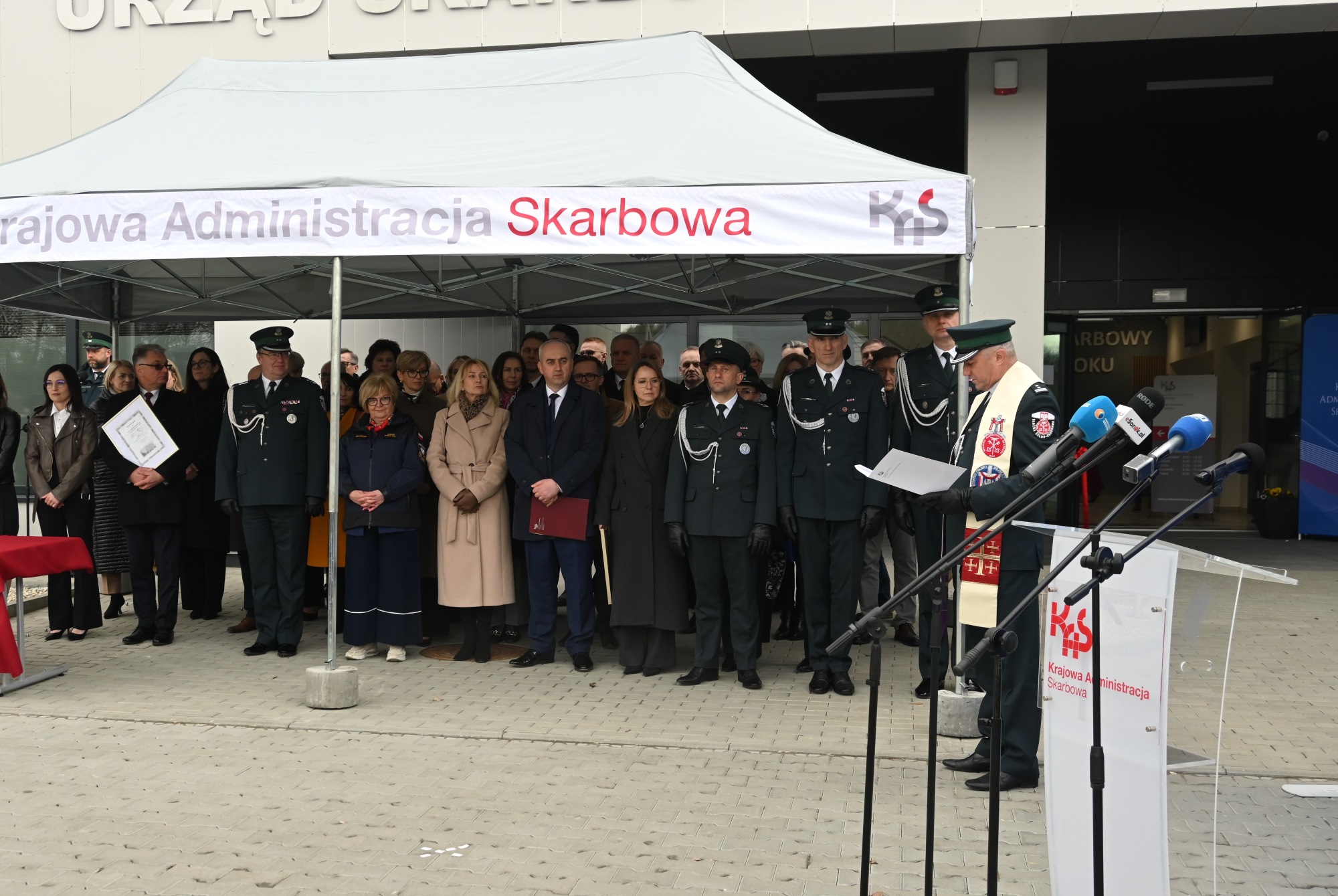 Poświęcenia nowej siedziby urzędu i pojazdów dokonał ksiądz dziekan, koordynator duszpasterzy Krajowej Administracji Skarbowej mł. insp. Krzysztof Skałkowski .
